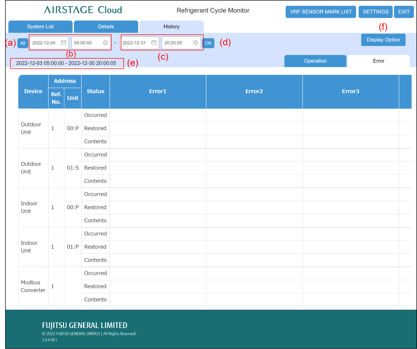 Displays the error histories of date and time set at (b) and (c) in (e) “Error history display range”.