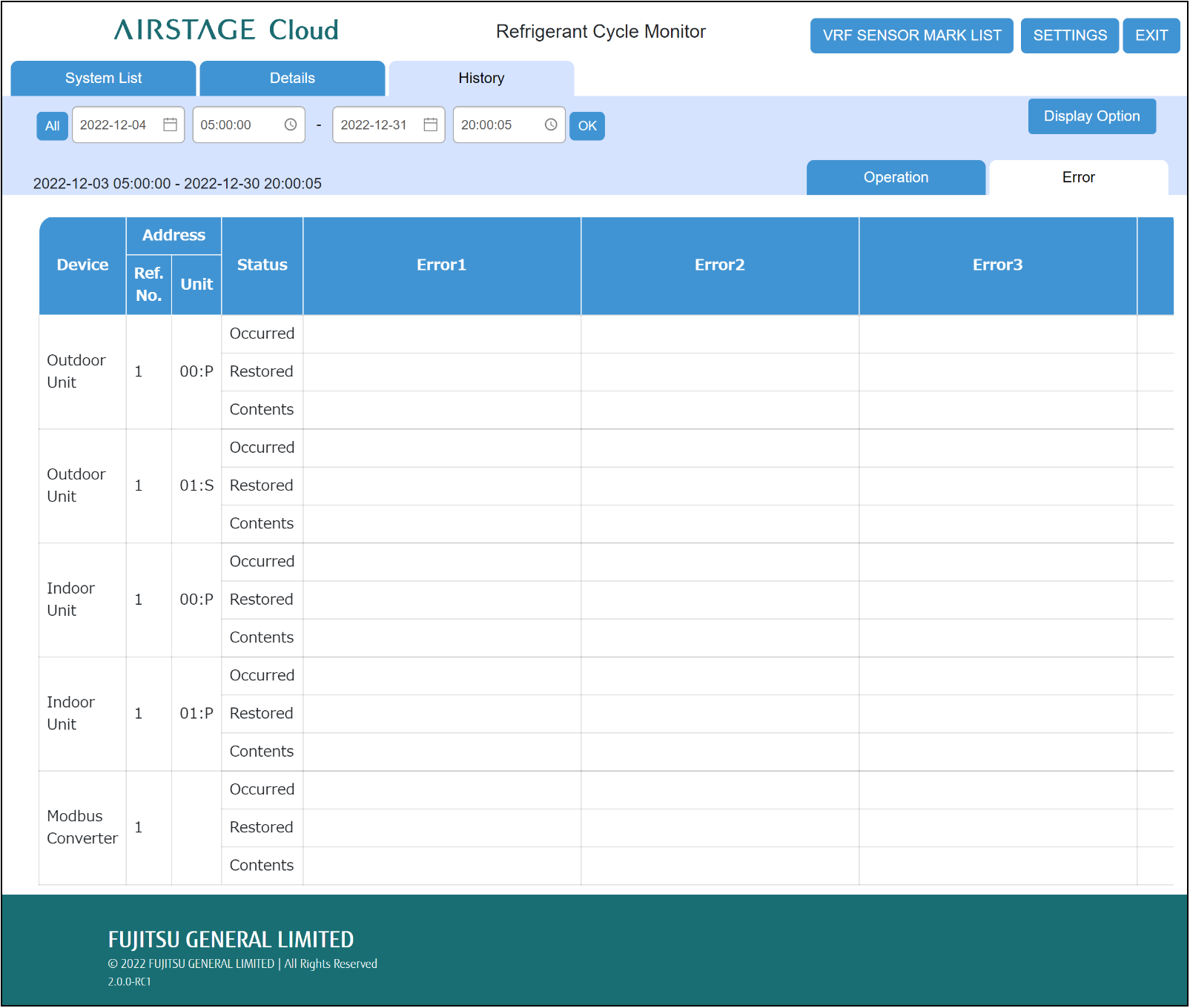 | Error 1 ~ 50 | Displays the error acquisition time and error contents. Displays currently generated errors in red. -"Occurred": Displays the date and time when an error occurs. -"Restored": Displays the date and time when an error is solved, and the unit is restored to its original state. -"Contents": Displays the error contents. |