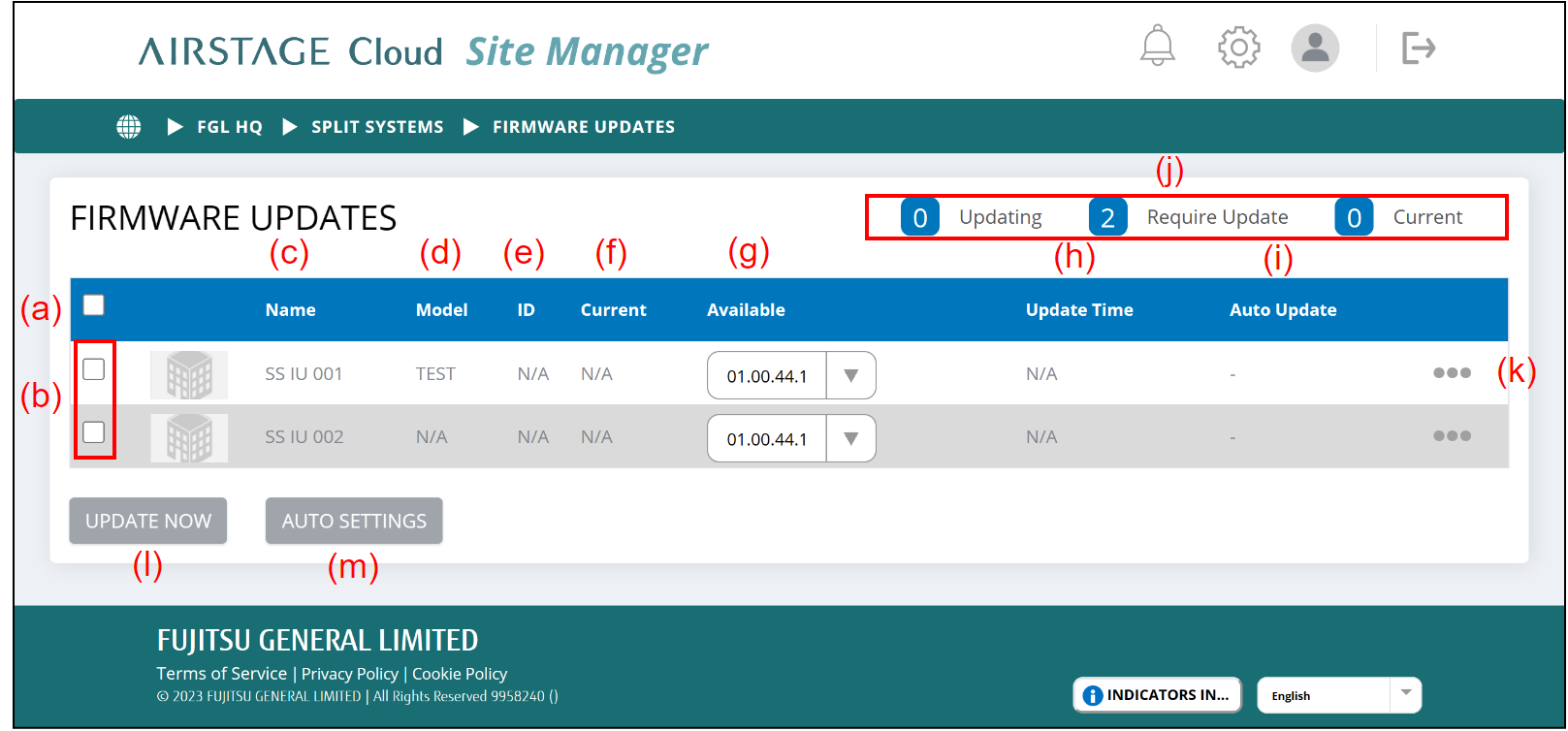This screen is displayed when the [UPDATES] button in FIRMWARE is selected on the Split Systems screen.