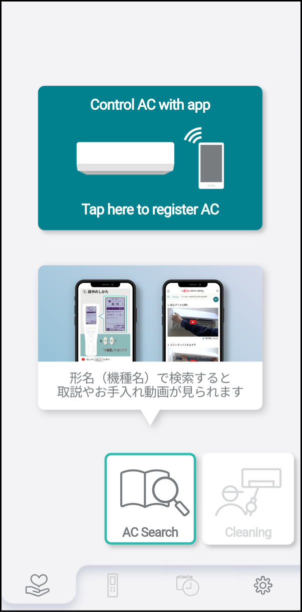 You can use "My AC Model (AC Search)", "Cleaning", "Repair", and "nocria shop". For details, refer to "Checking Air Conditioner Support Information".