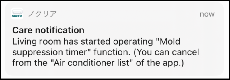 When the air conditioner is set to a Whole clean timer or Mold suppression timer, a push notification is sent when a function has been operated.