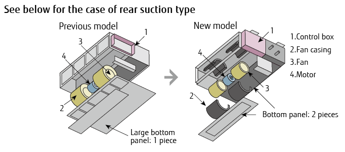 Das Bodenpaneel besteht auf einem vorderen und einem hinteren Teil. Auch das Innenlüftergehäuse besteht aus zwei Teilen – einer oberen und einer unteren Komponente. Sie können ganz einfach auf den Motor und den Lüfter zugreifen und diese warten, indem Sie das hintere Paneel und die untere Gehäusekomponente entfernen, ohne das Hauptgehäuse zu bewegen.