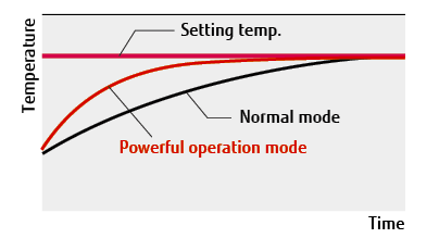 Im leistungsstarken Betrieb arbeitet der Kompressor 20 Minuten lang mit maximaler Geschwindigkeit, um einen starken Luftstrom zu erzeugen. Er kühlt oder heizt den Raum schnell auf die gewünschte Temperatur.