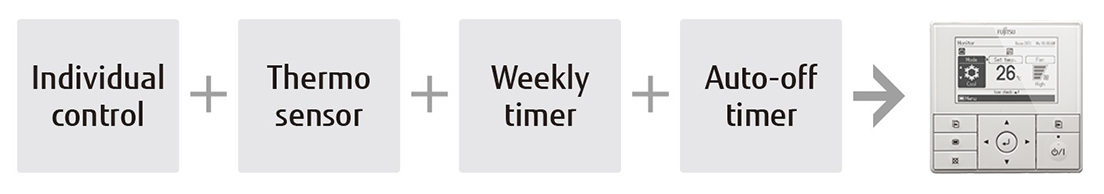 - Een enkele afstandsbediening bestuurt elk aangesloten binnendeel en biedt een verscheidenheid aan energiebesparende opties.