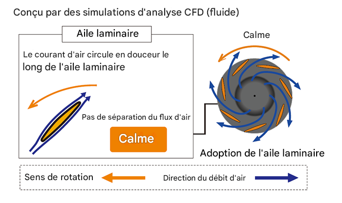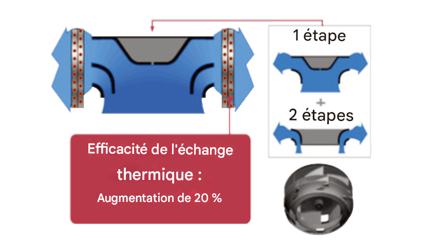 L’air est réparti uniformément dans l’échangeur thermique grâce au turbo-ventilateur à 2 phases qui produit deux flux d’air distincts.