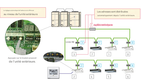 Les adresses des unités intérieures, des unités RB et de l'amplificateur de signal connectés peuvent toutes être définies automatiquement à partir du circuit imprimé de l'unité extérieure.