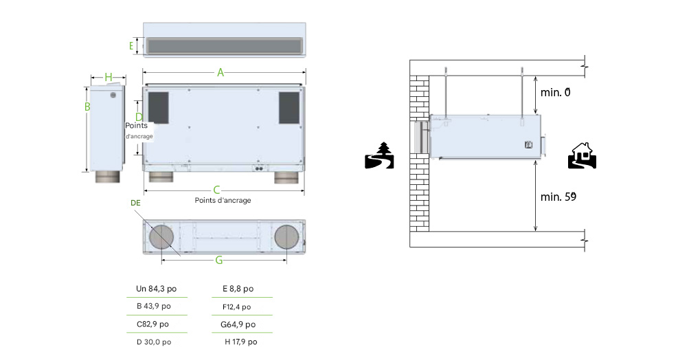 | Raccord de conduit (air extérieur, air d’échappement) | 30,5 cm diam. (12,4 po) min. (781 cm² [121 po²]) |