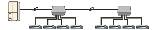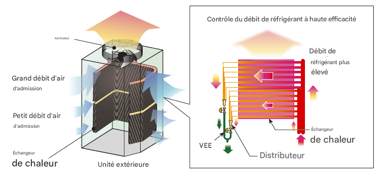 Lorsque plusieurs appareils extérieurs sont connectés, chaque compresseur effectue un fonctionnement sophistiqué. L’efficacité s’en trouve améliorée grâce à l’ensemble des compresseurs à charge partielle et à la distribution de réfrigérant dans l’ensemble des échangeurs thermiques plutôt qu’à un seul compresseur.