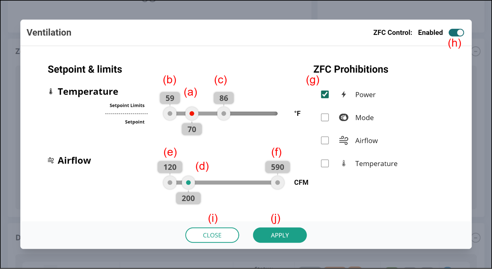 - When Disable is selected, Ventilation ZFC does not control the ventilation settings of devices that can set ventilations registered in the Zone to be set to the Ventilation ZFC setting. In addition, (a) to (f) settings are not reflected to the Ventilation ZFC operations.