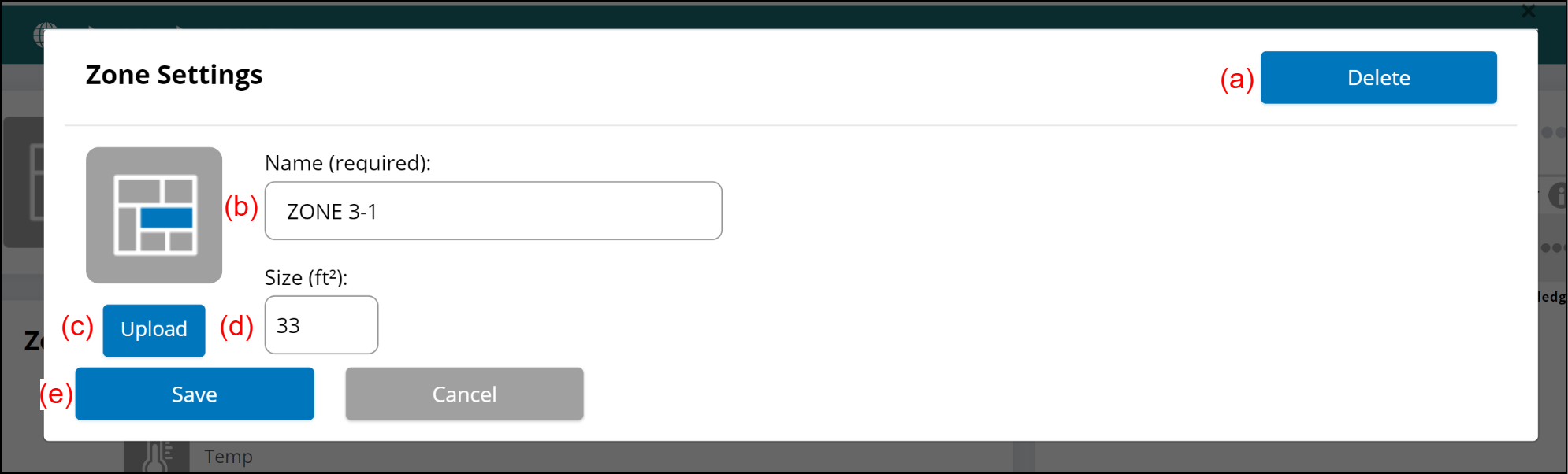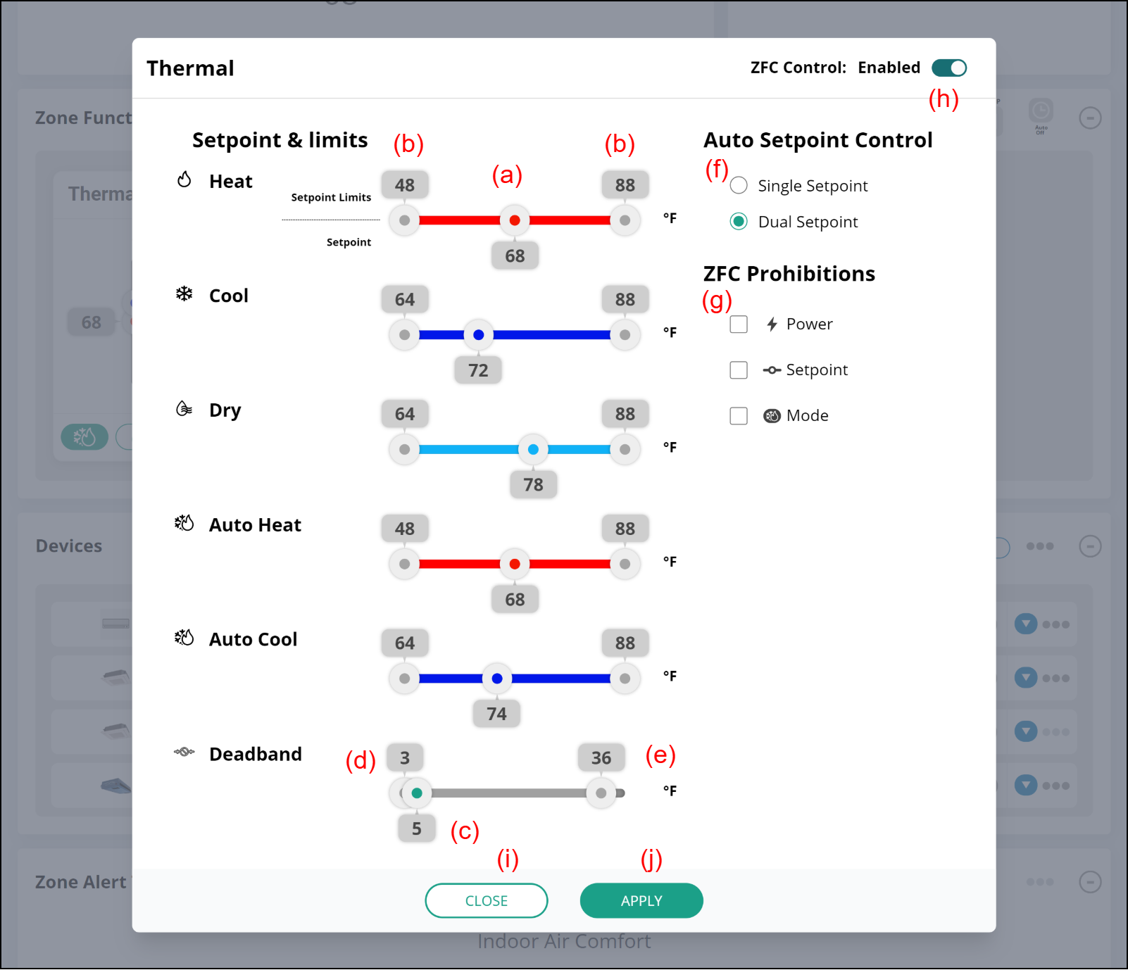 - When Disable is selected, Thermal ZFC does not control the temperature settings of devices that can set temperatures registered in the Zone to be set to the Thermal ZFC setting. This indicates that devices already registered in the zone are controlled individually. In addition, (a) to (g) settings are not reflected to the Thermal ZFC operations.