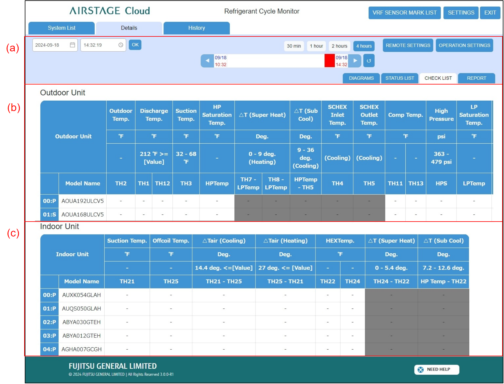 The sensor value calculated in the condition set at Control area is displayed for each outdoor / indoor unit. The judgment results are also displayed. If the calculated sensor value is deviated from the normal value, the background of the data cell becomes red.
