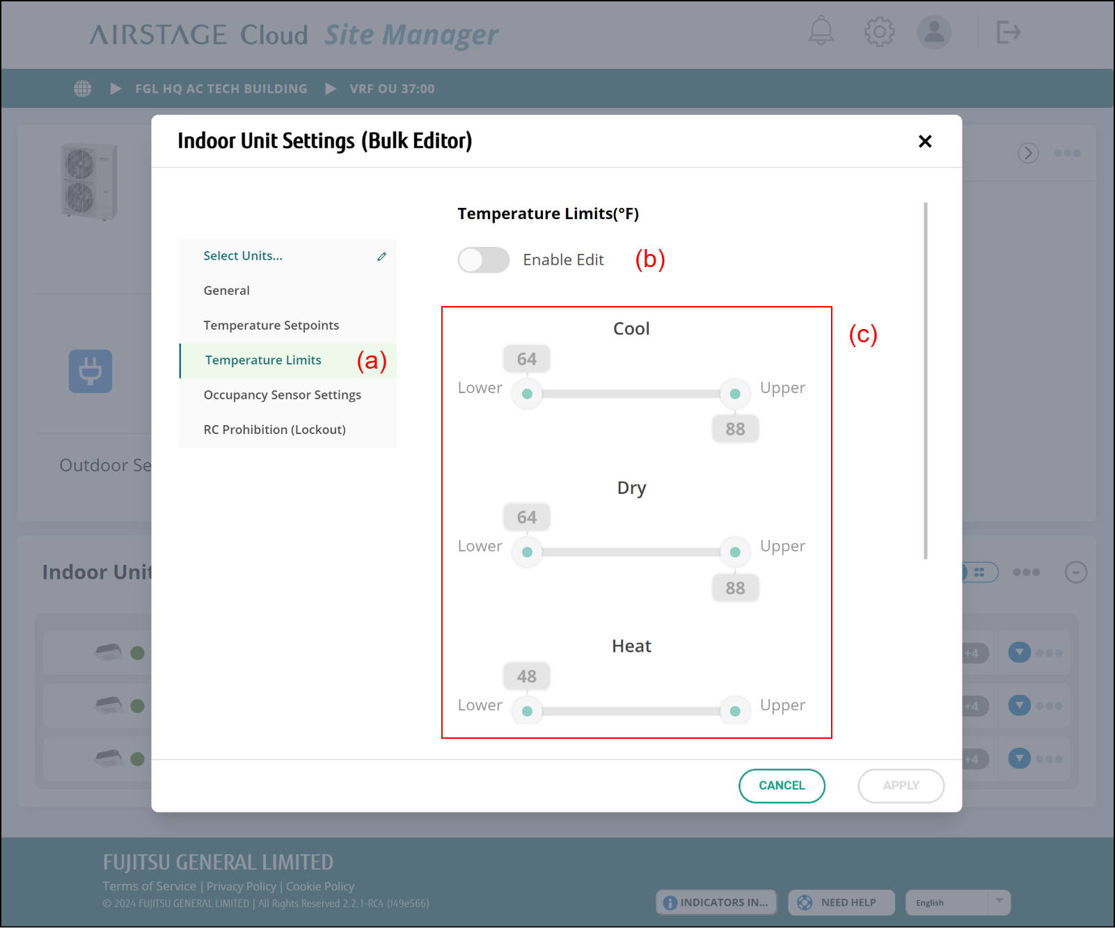 Bulk setting changes for indoor units in this refrigerant system can be performed on the VRF Dashboard screen.