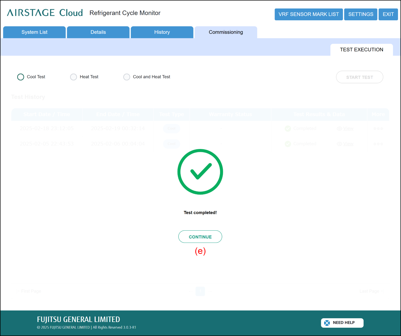 - When the test is completed, its status becomes completed. Tap the [CONTINUE] button (e) to return to the original screen.