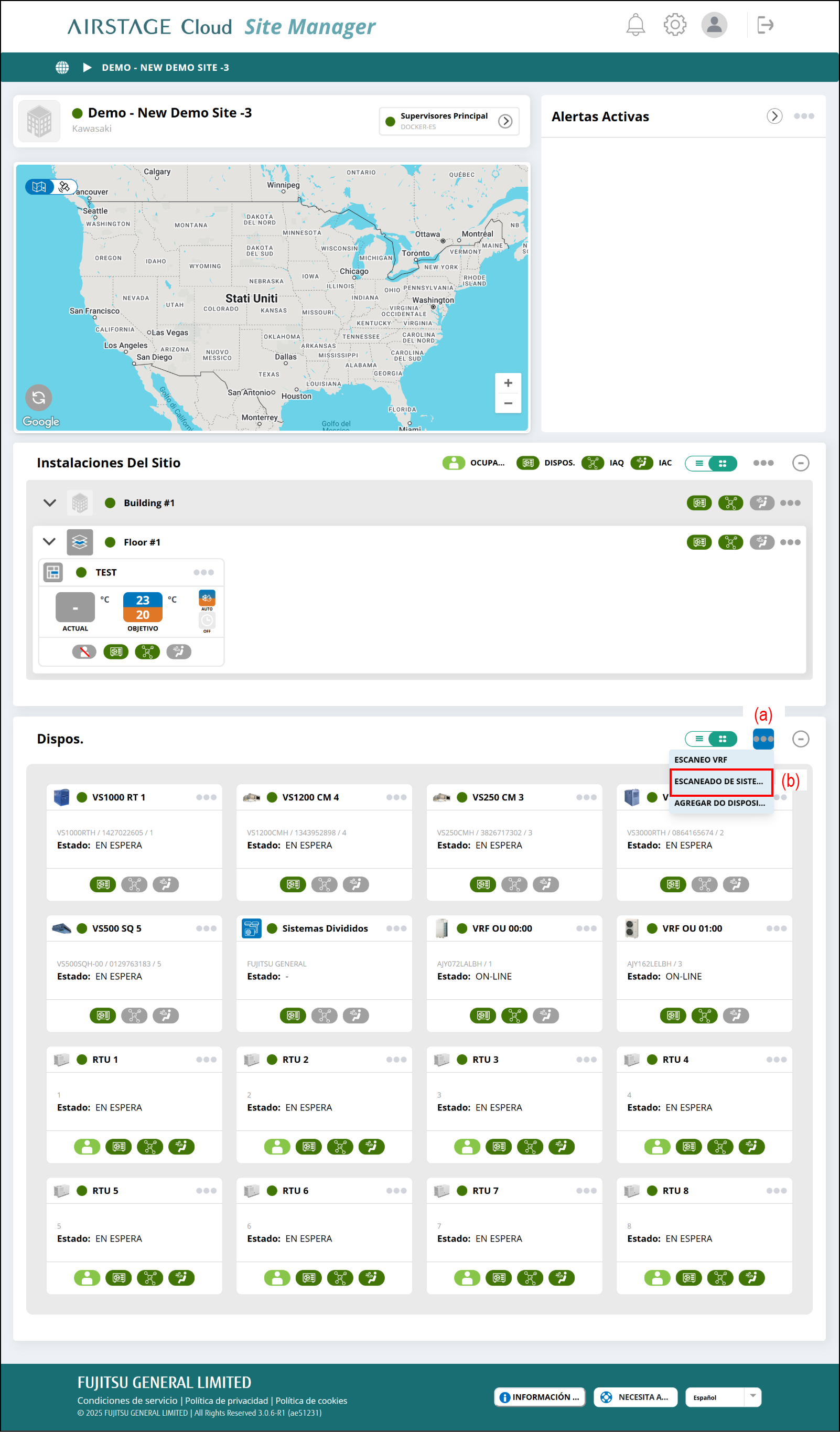 - Seleccione el botón (a) de “Dispos” en la pantalla Panel de control del sitio.