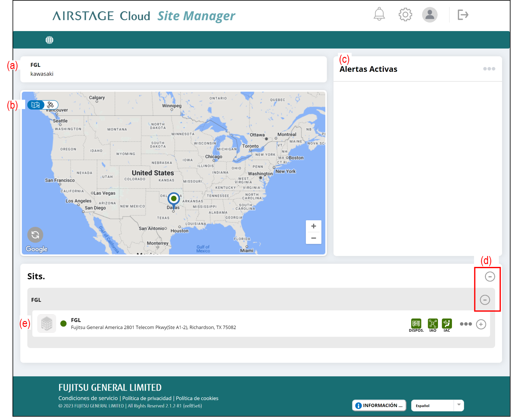 Cuando seleccione el icono del sitio en el mapa, aparecerá la pantalla “Panel de control del sitio”.