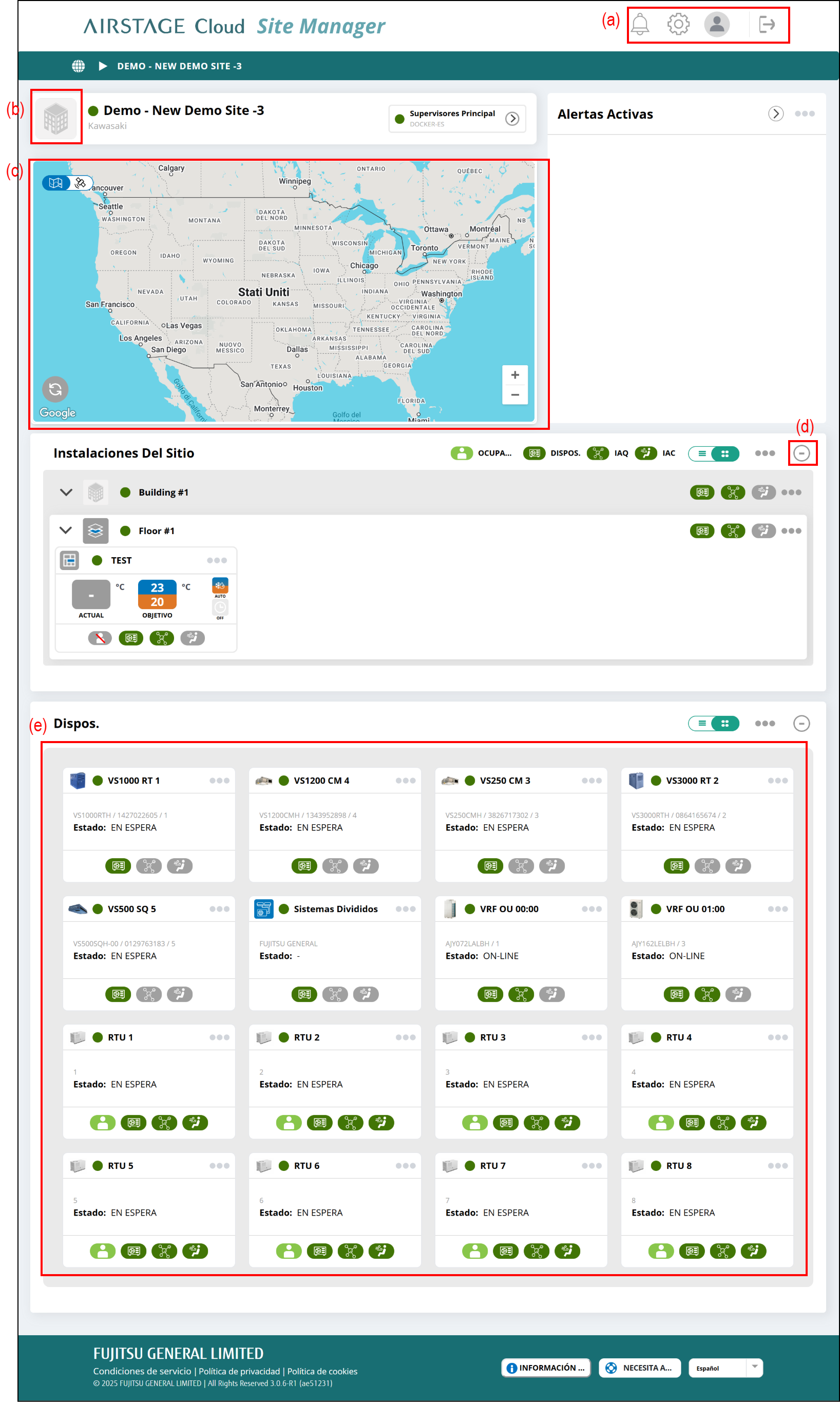 Cuando se inicia sesión, se muestra el Panel de control del sitio del sitio en el que se ha colocado el AIRSTAGE Edge Controller.