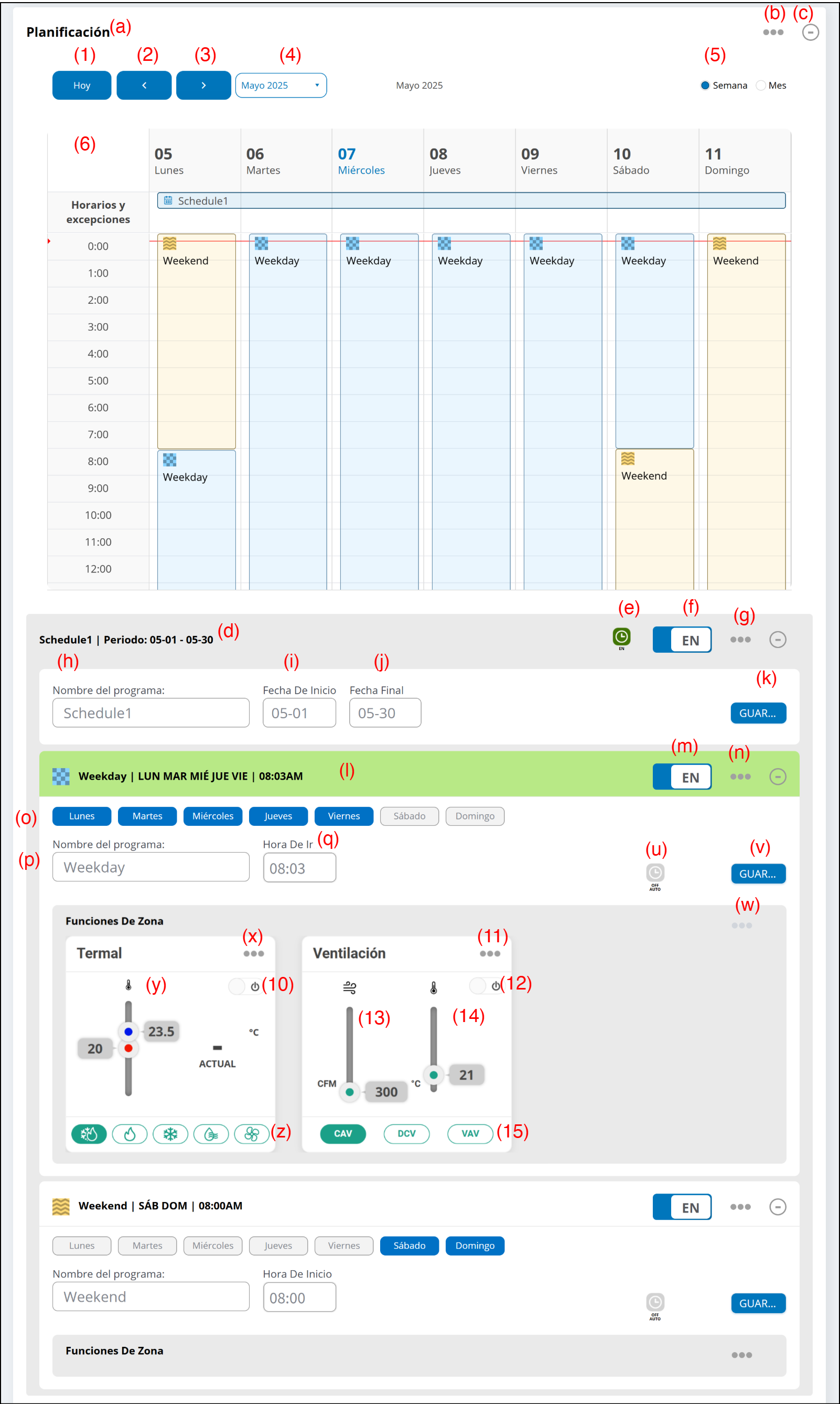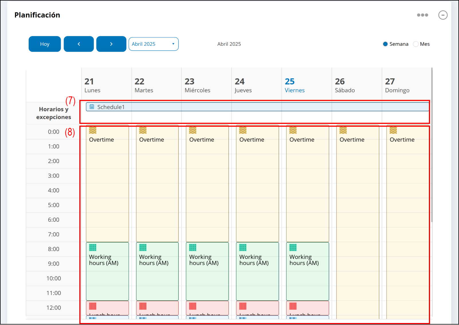 (7) Cuando se configura un horario o una excepción, se muestra en la parte superior de la pantalla.