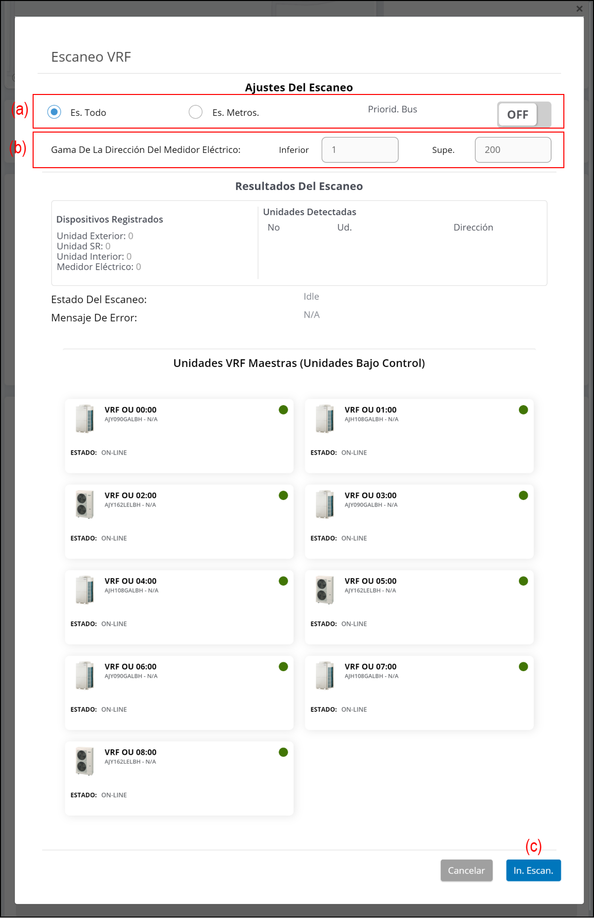 - Al seleccionar “Es. Todo”, la unidad exterior, la unidad interior, el contador eléctrico y la unidad SR conectados a la red VRF se escanean y registran.
