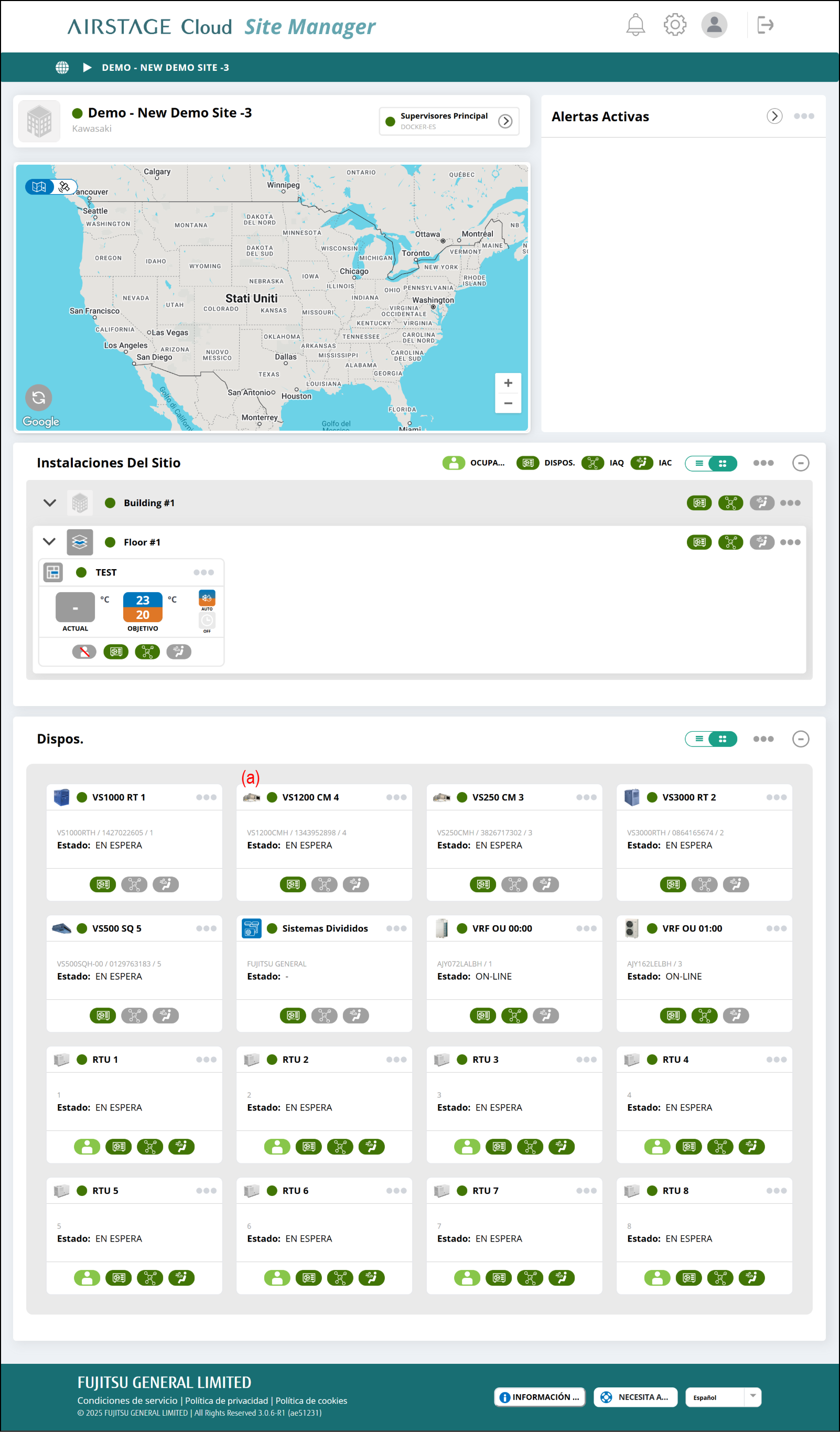 Después de ajustar las coordenadas, se mostrará la ubicación de la unidad exterior en el mapa de la pantalla “Panel de control del sitio”.