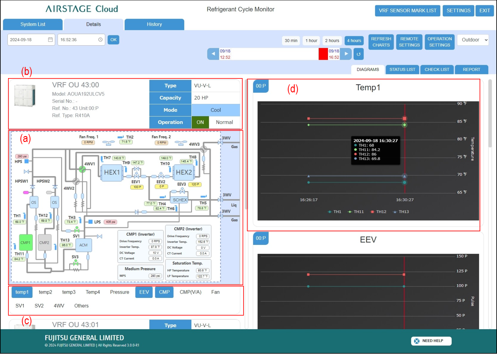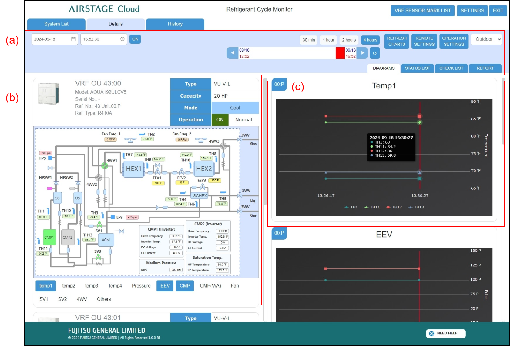 | CMP | Muestra el estado de funcionamiento del compresor en la zona de gráfico. Para un compresor inversor, también se muestra la frecuencia de funcionamiento. |