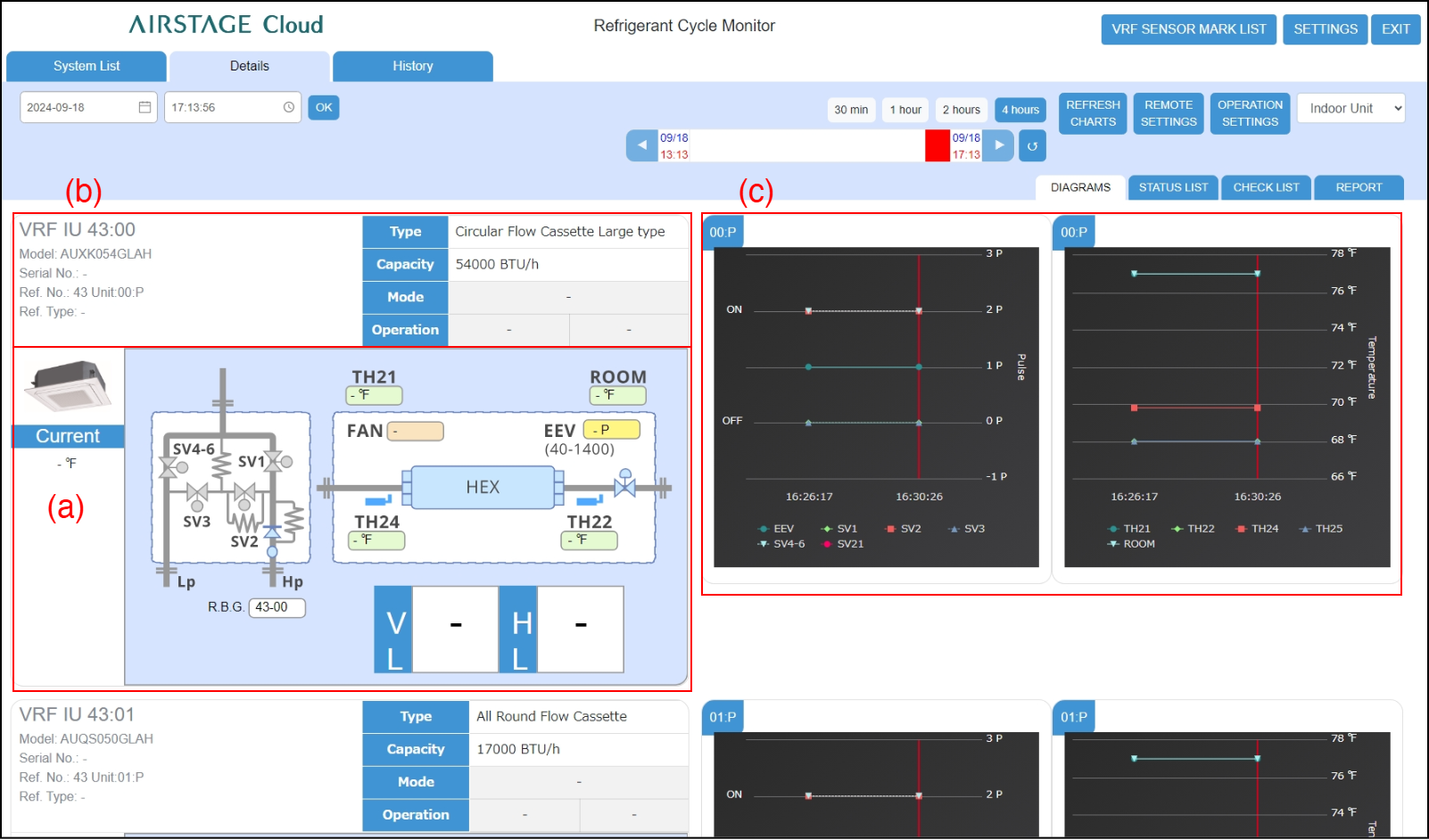 | Schematic | Muestra el esquema de la unidad interior. El estado de la unidad SR solamente puede visualizarse al lado del sistema de refrigerante cuando el tipo de sistema es recuperación del calor. |