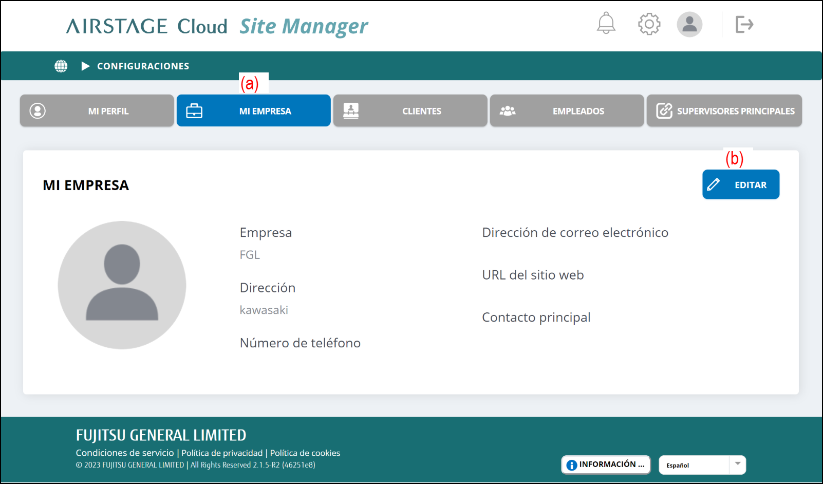 Aparecerá la pantalla “MI EMPRESA” y podrá comprobar la información de su empresa. - Par editar la información de su empresa, seleccione el botón (b).