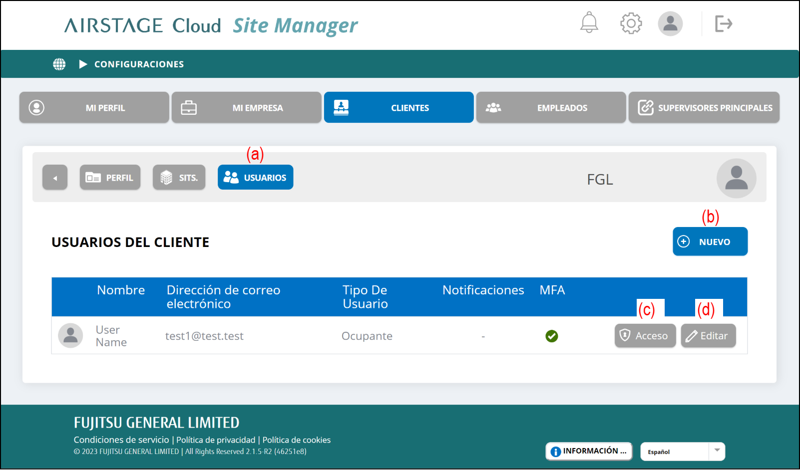 Puede comprobar, editar, añadir o borrar los usuarios que pertenecen al cliente.