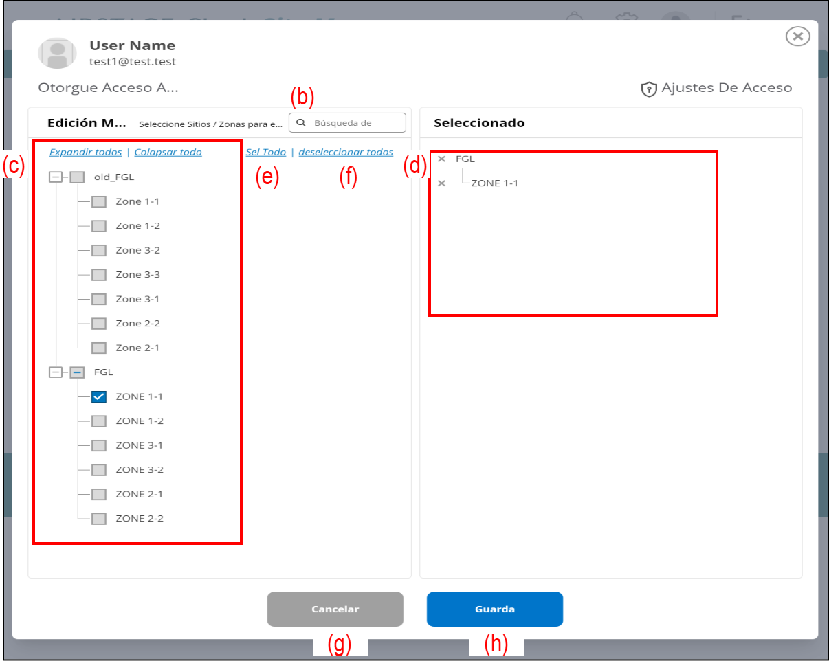 Seleccione los sitios o zonas a los que el usuario del cliente puede acceder.