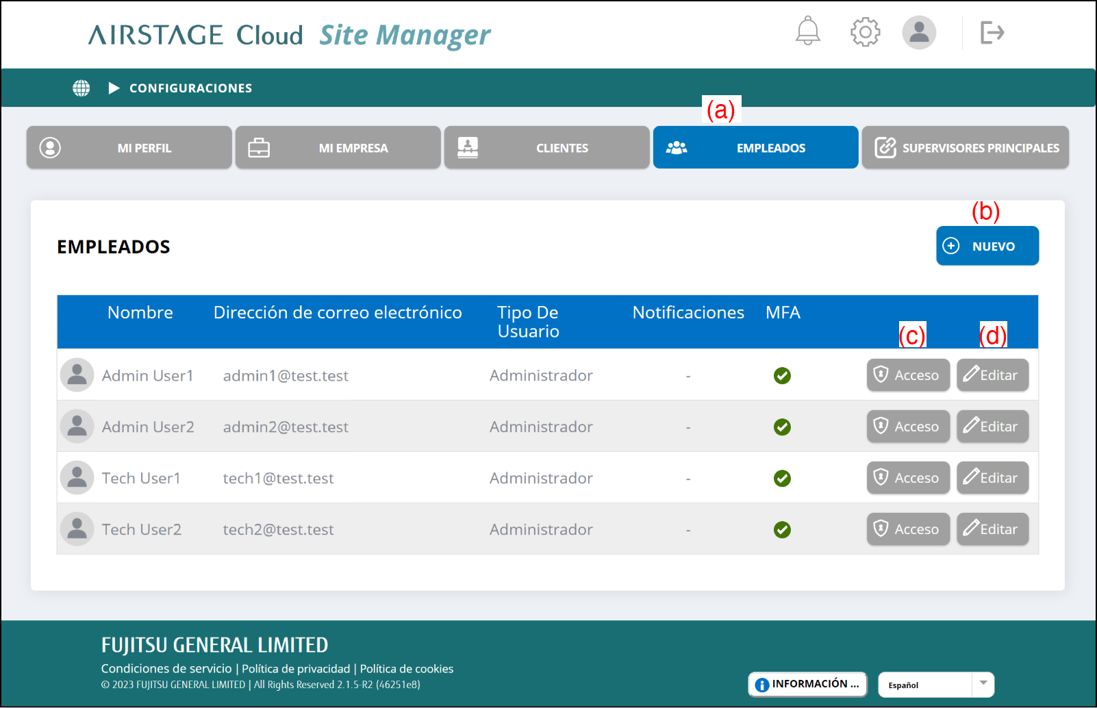 Aparecerá la pantalla “EMPLEADOS” y podrá consultar la lista de empleados.Seleccione el botón (b) a (d) según sus intenciones.