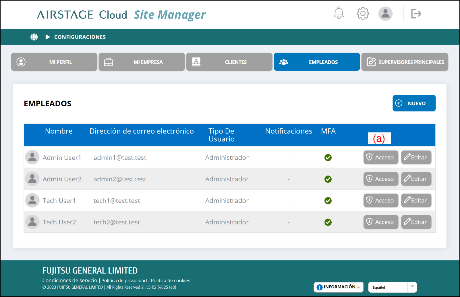 - Seleccione el botón [Acceso] (a) del empleado en la pantalla “EMPLEADOS”.