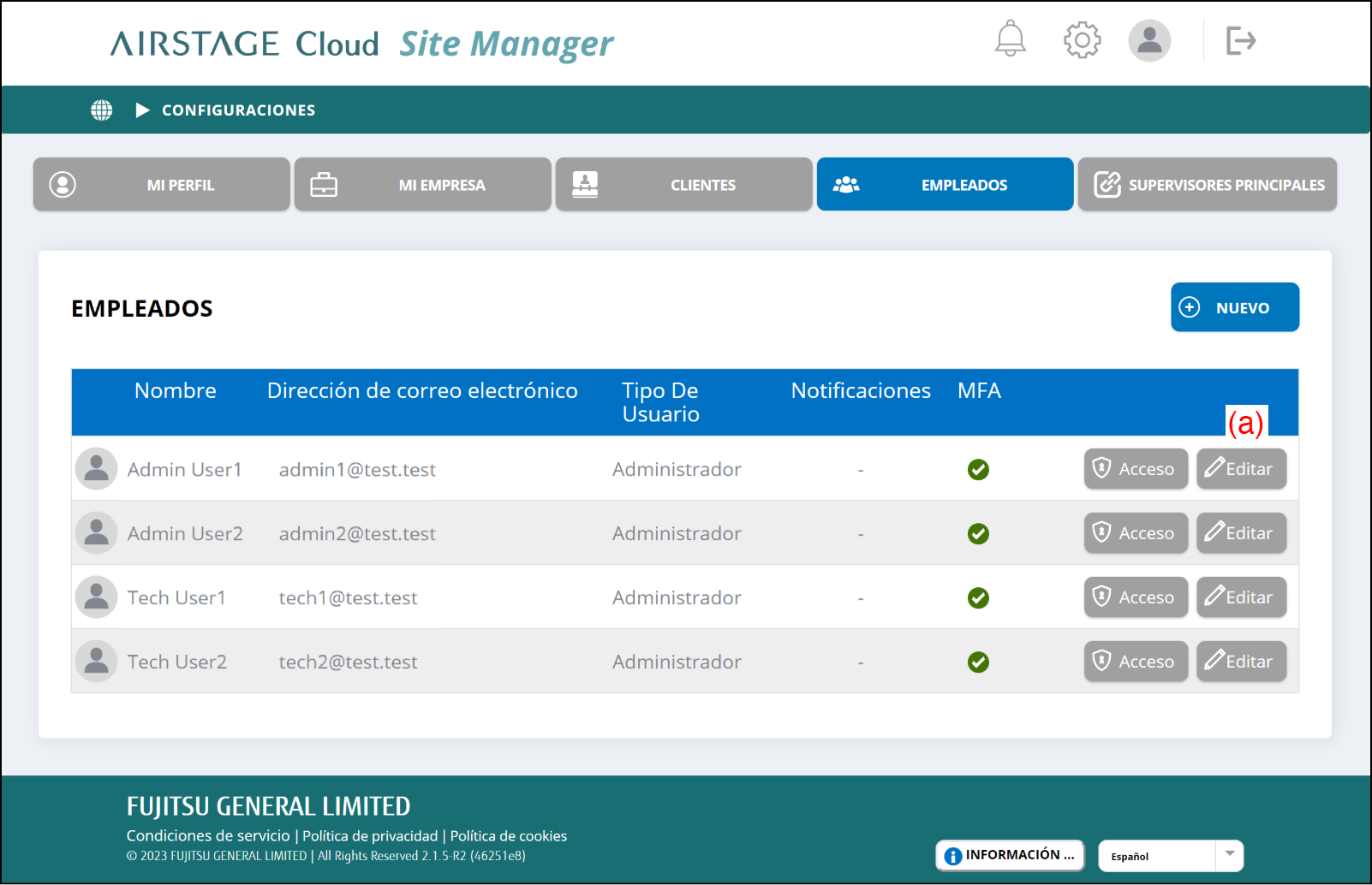 | (m) | Botón [REENVIAR INVITACIÓN] | Seleccione para reenviar el correo electrónico de invitación al empleado. *Antes de reenviar la invitación, compruebe lo siguiente: