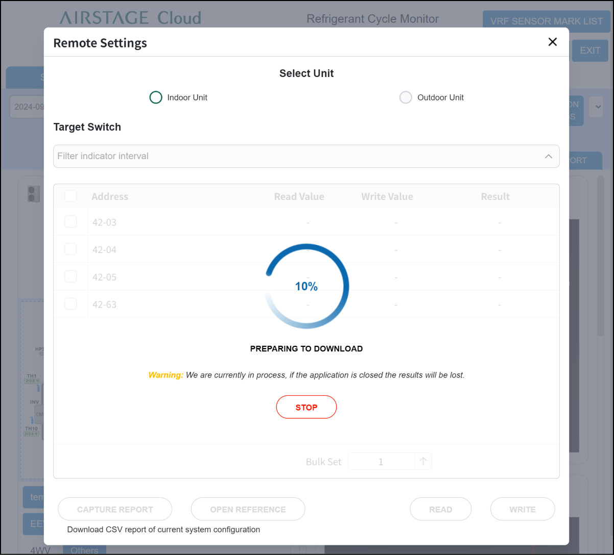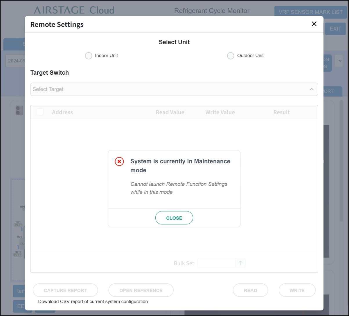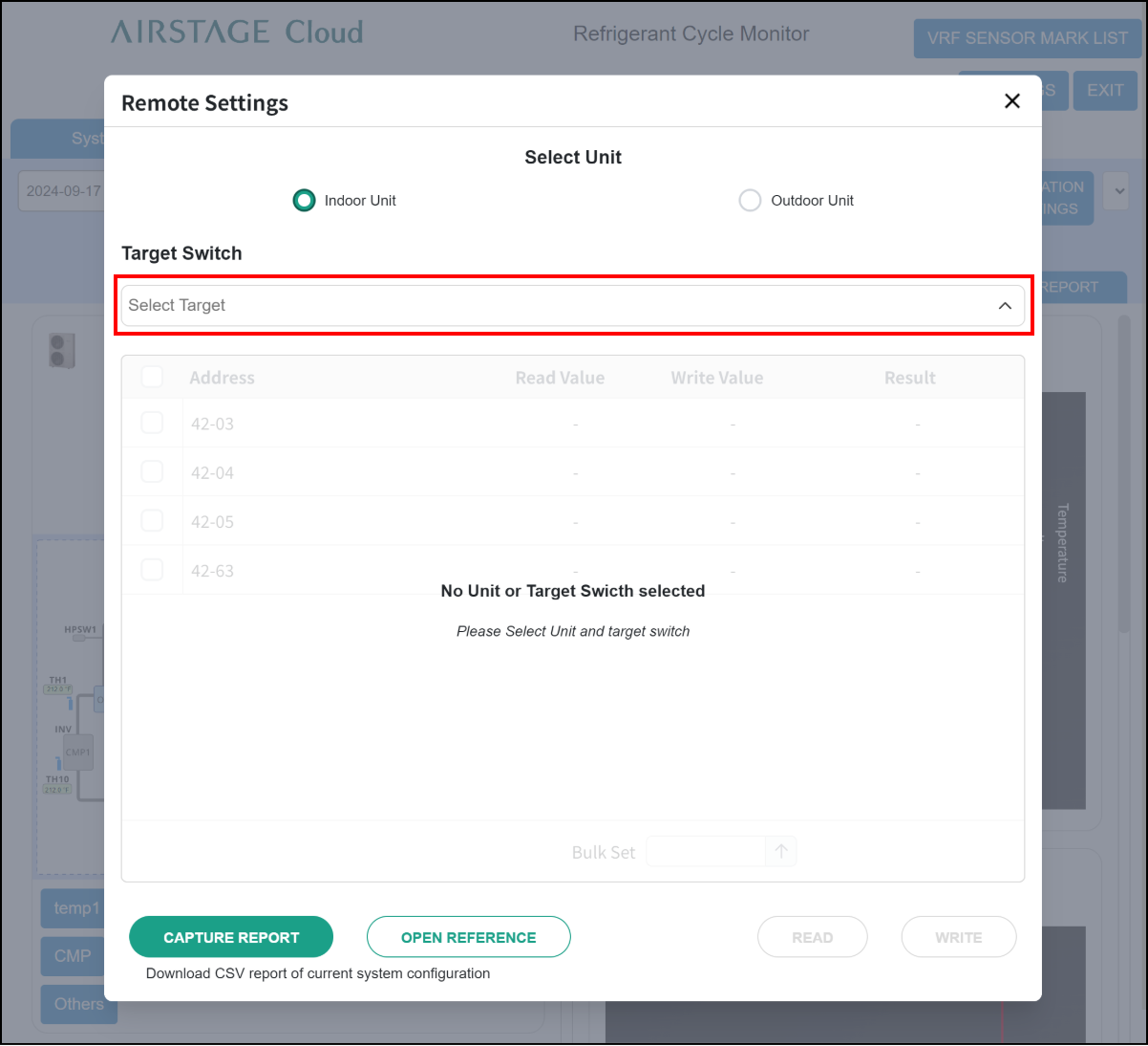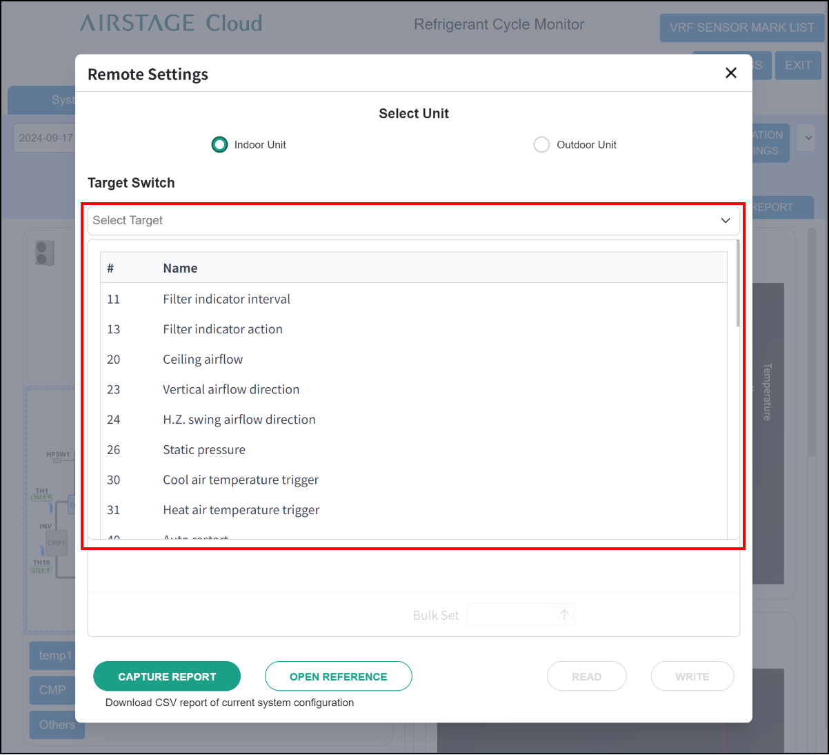 - Pulse el botón “REMOTE SETTINGS” en la pantalla “Refrigerant Cycle Monitor”.