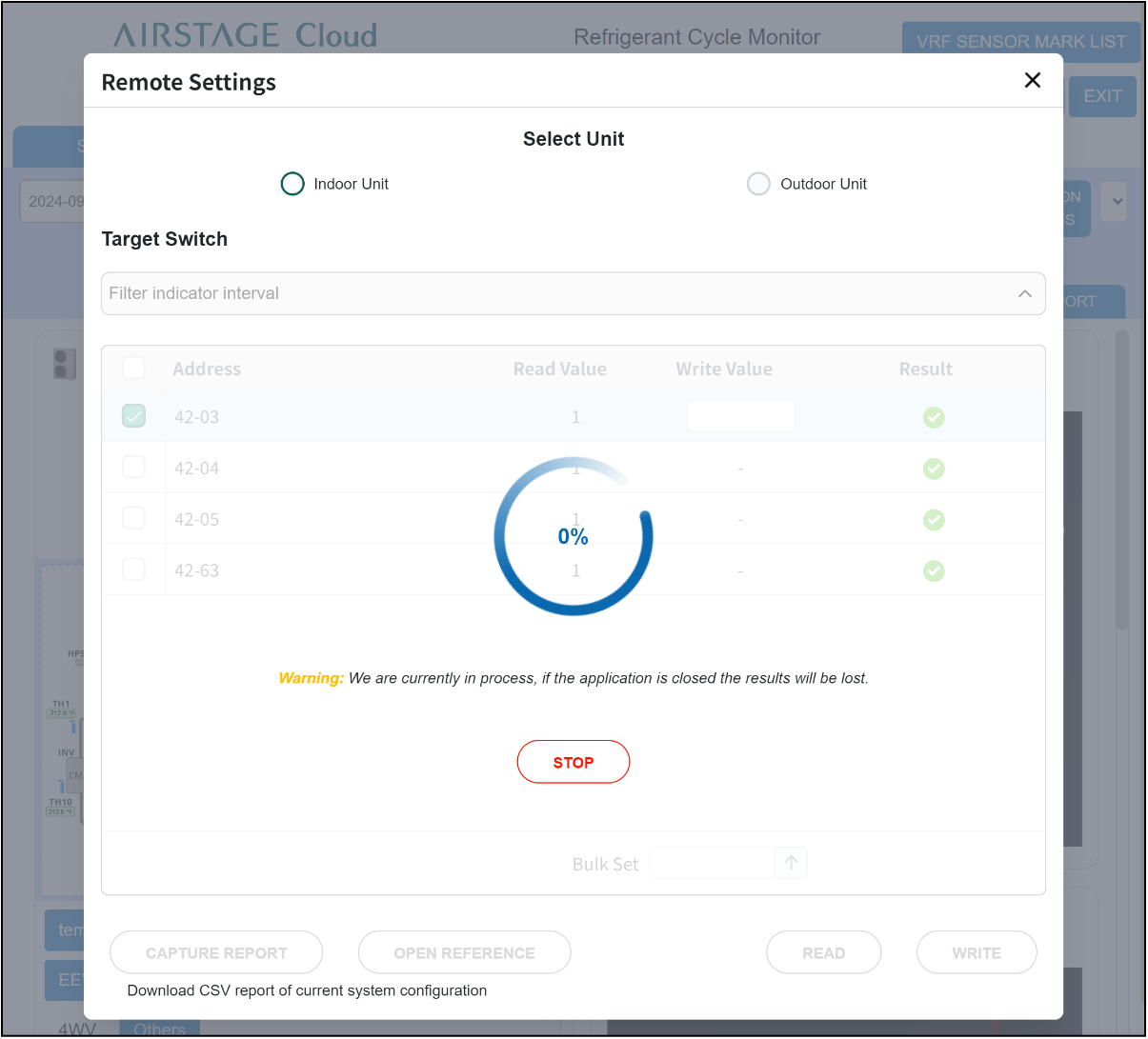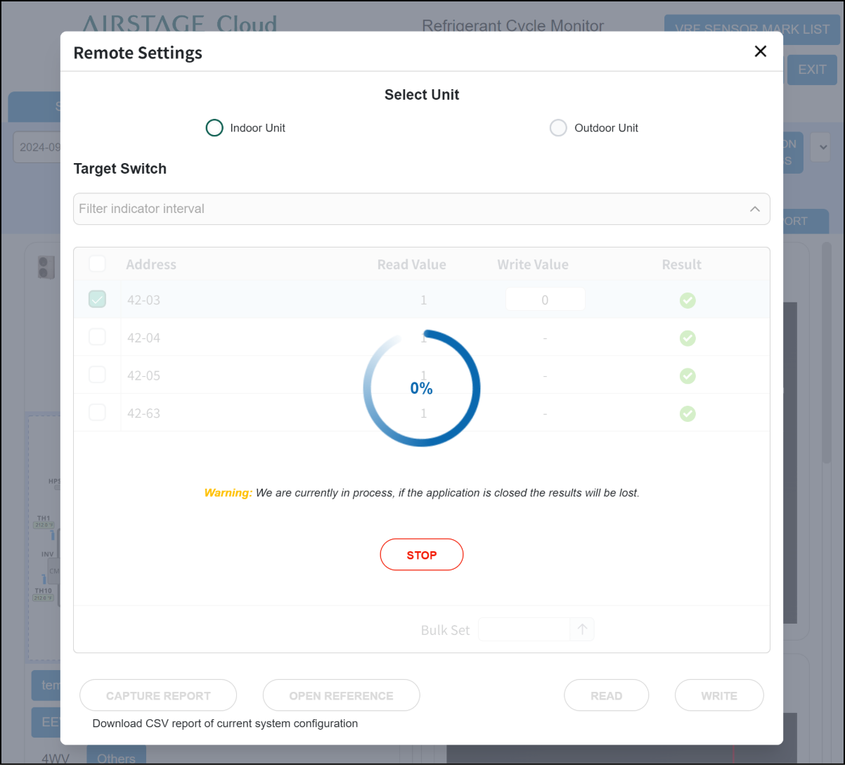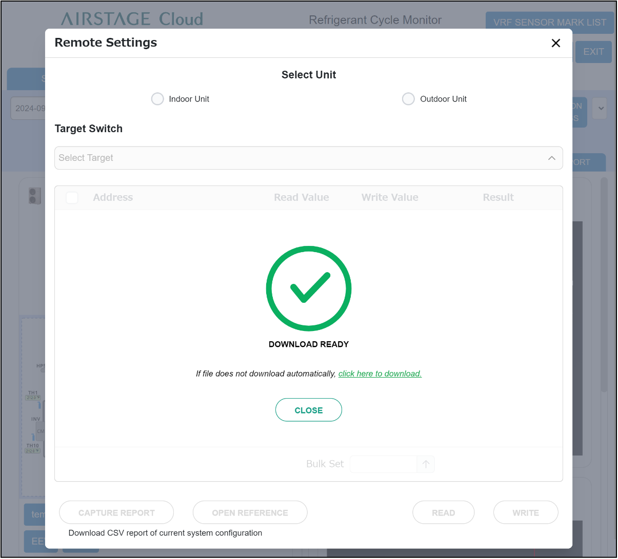 - Pulse el botón “REMOTE SETTINGS” en la pantalla “Refrigerant Cycle Monitor”.
