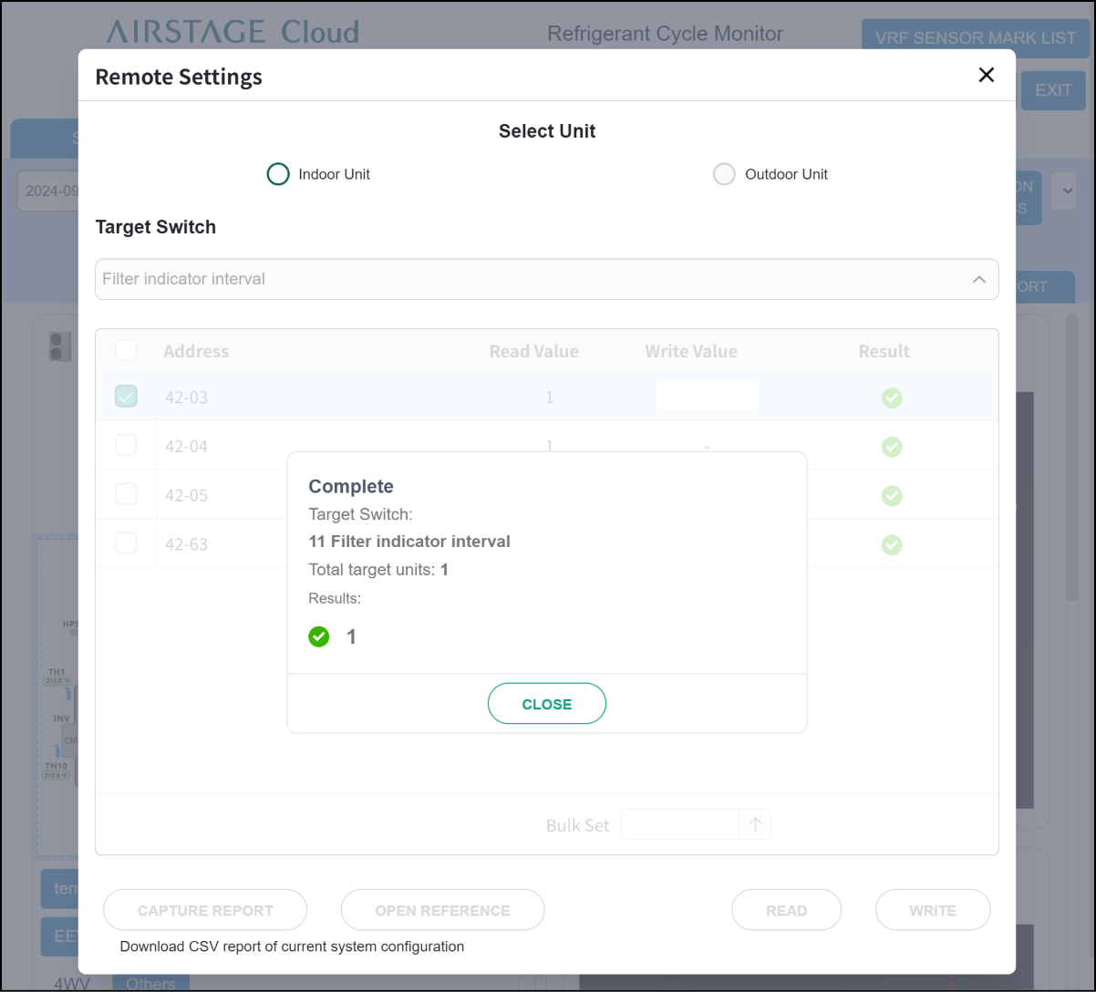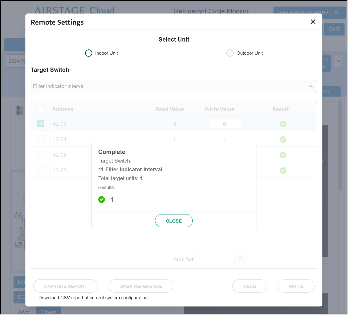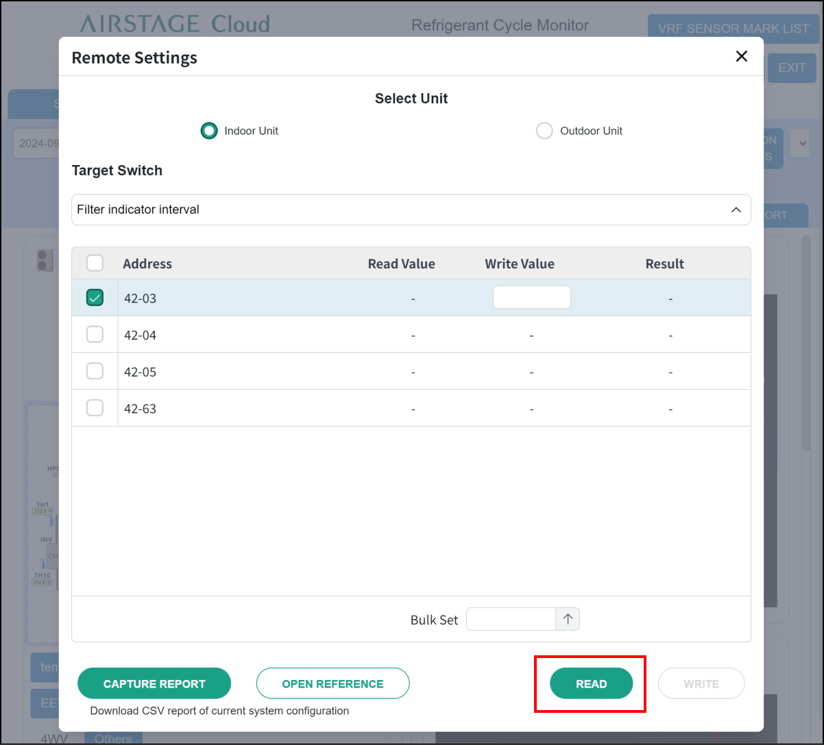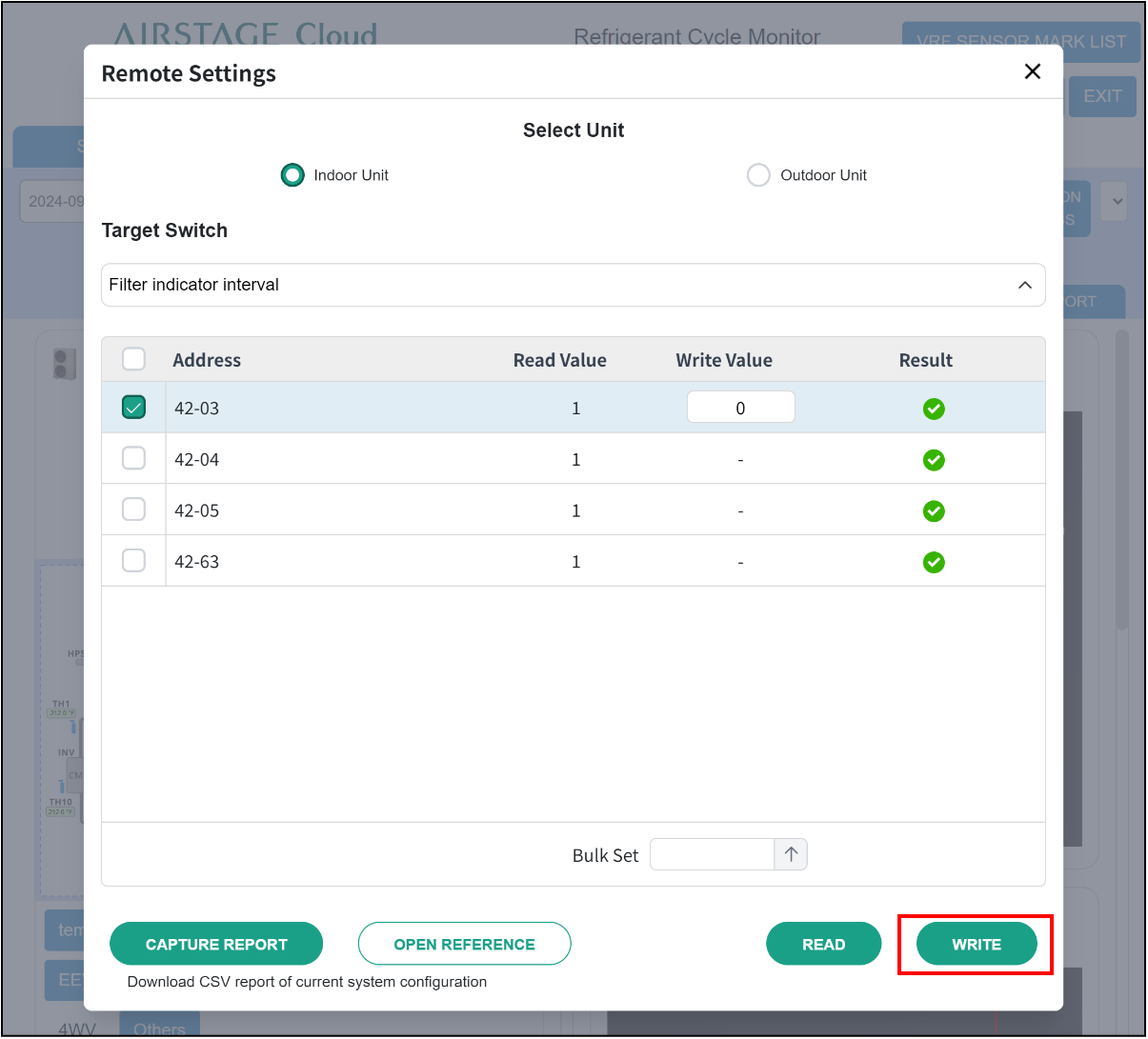 - Pulse el botón “REMOTE SETTINGS” en la pantalla “Refrigerant Cycle Monitor”.