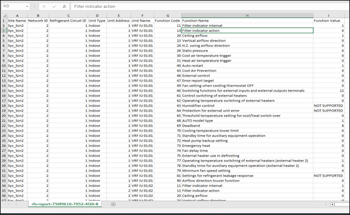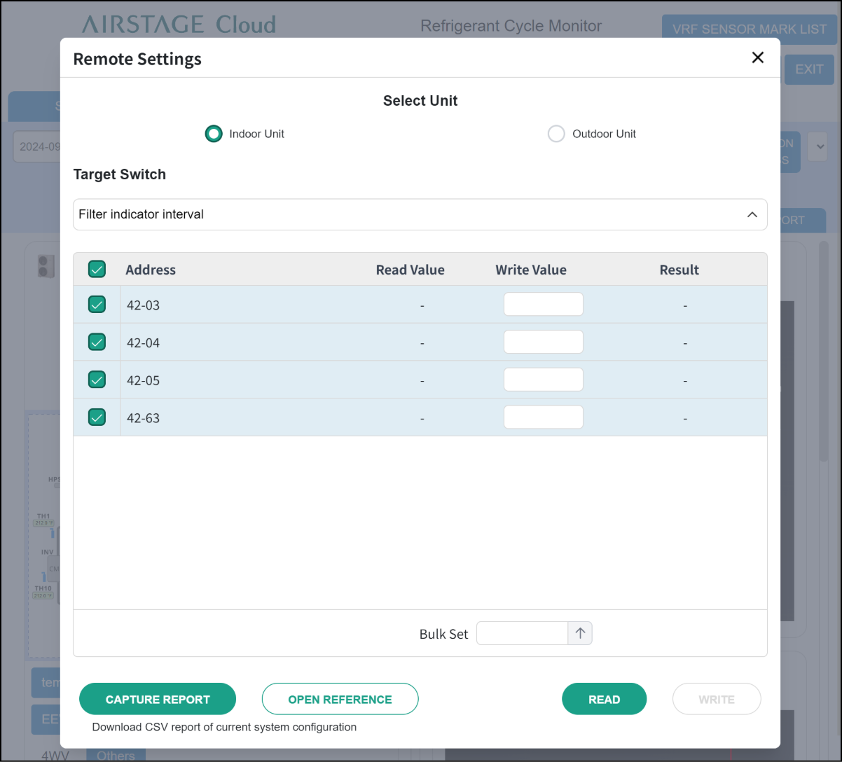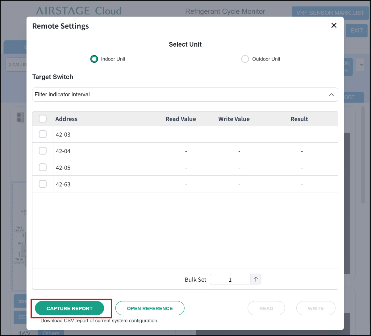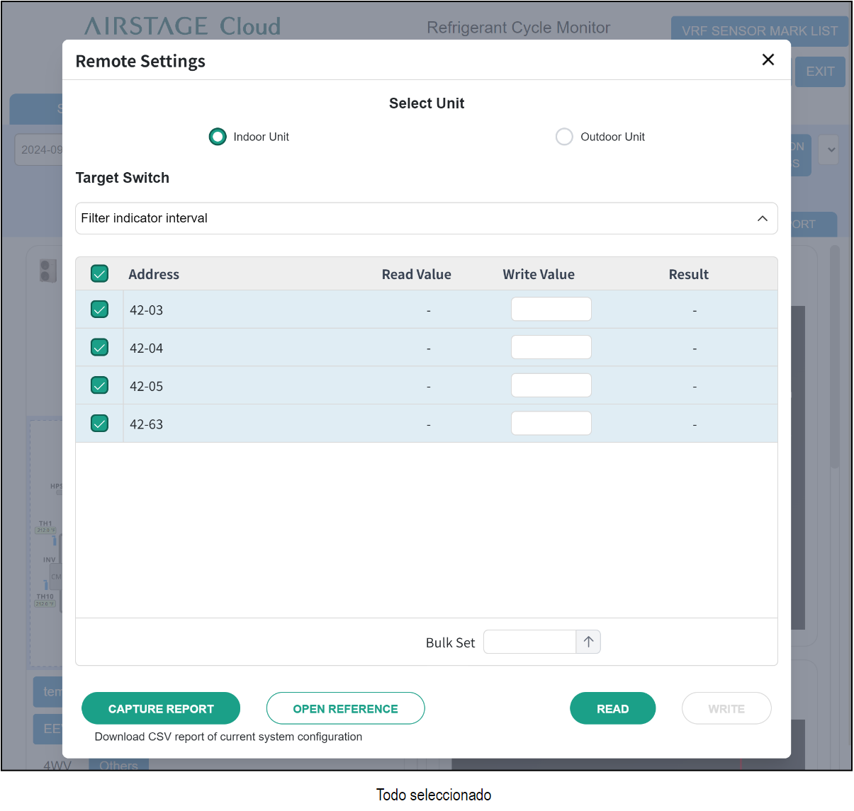 - La función “CAPTURE REPORT” puede utilizarse para emitir el valor actual del ajuste de la función para todas las unidades interiores y exteriores y comprobarlas todas colectivamente.