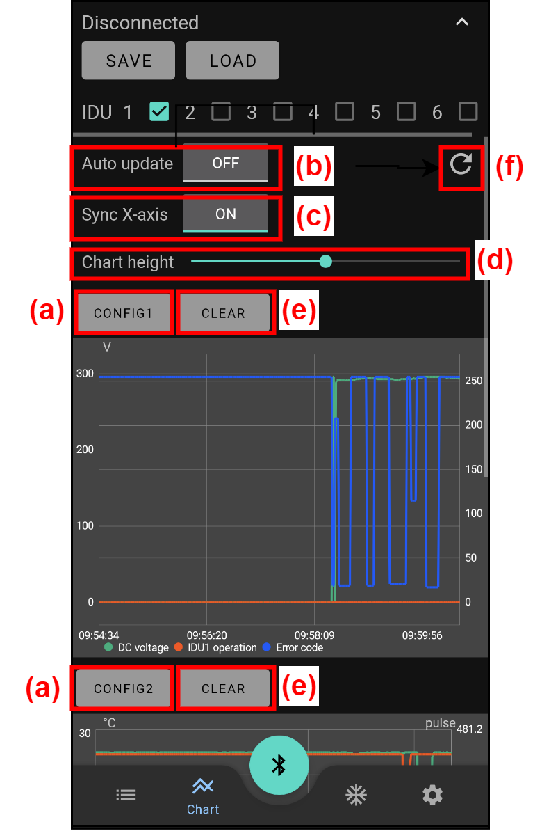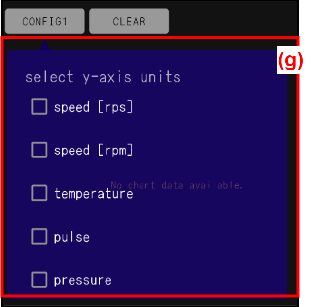 | (a) | [CONFIG] button | Select the target to be displayed from (g). Up to two units can be set per chart. |