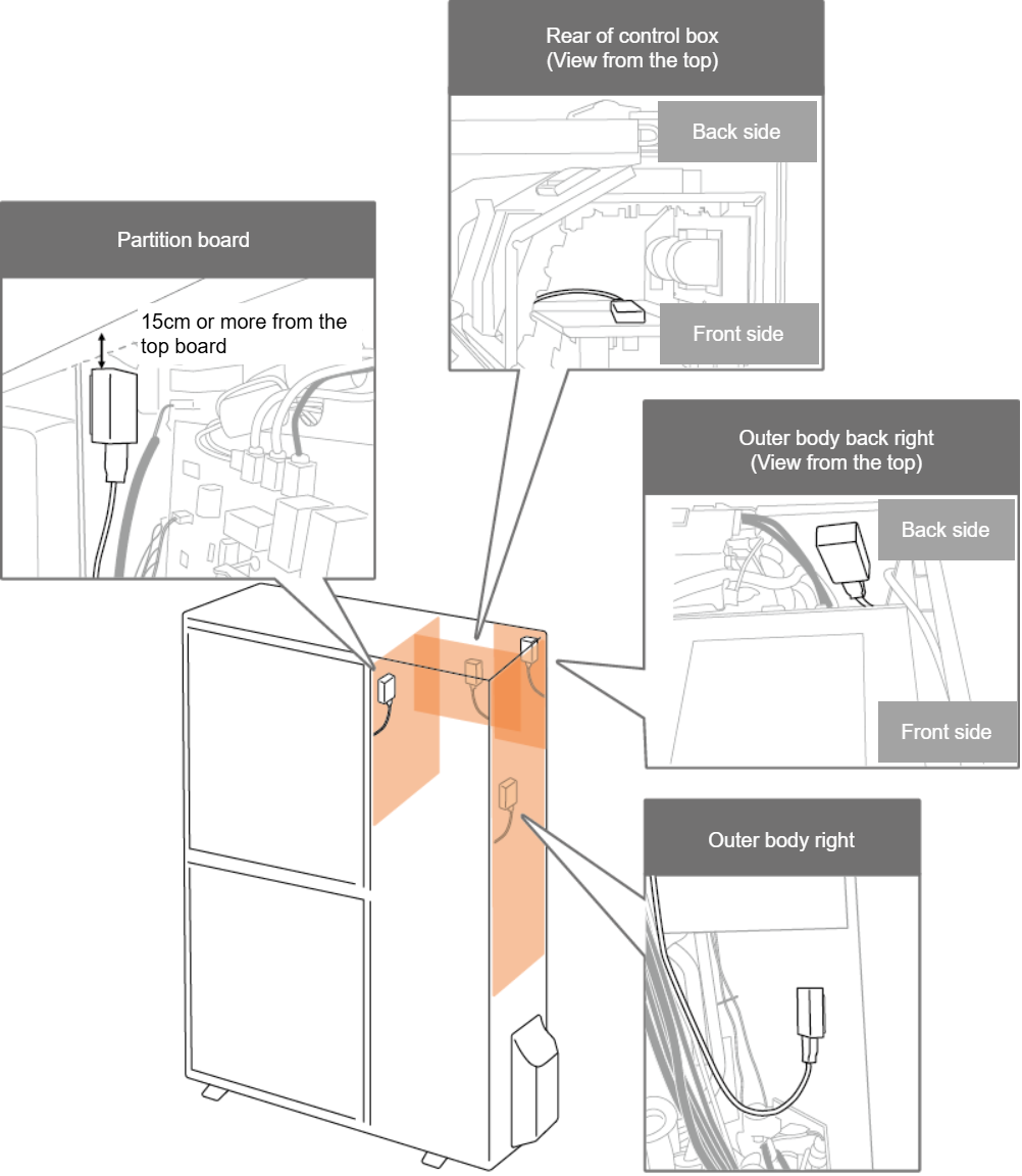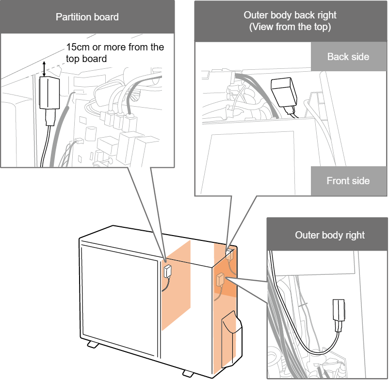 ・Do not bundle the power supply lead, the compressor lead, the fan motor lead and the harness of Service Monitor Tool together. ・Do not get it in contact with the surrounding piping. ・The USB terminal side of BLE adapter should be facing down so that the condensation water inside the outdoor unit does not enter the BLE adapter. (In addition, if vinyl tape or similar material is wrapped around the USB terminal of the BLE adapter, it will be more effective.) ・When BLE adapter is installed, remove dust or oil before installing. ・When installing BLE adapter, do not touch metal parts such as sheet metal. ・When BLE adapter is installed on the partition board, place it at least 15 cm away from the top board. ・When BLE adapter is installed on the partition board, do not install it near the slit hole. ・Do not allow the cable for control PCB (TYPE 1/2/3) to come into contact with metal parts such as sheet metal. |