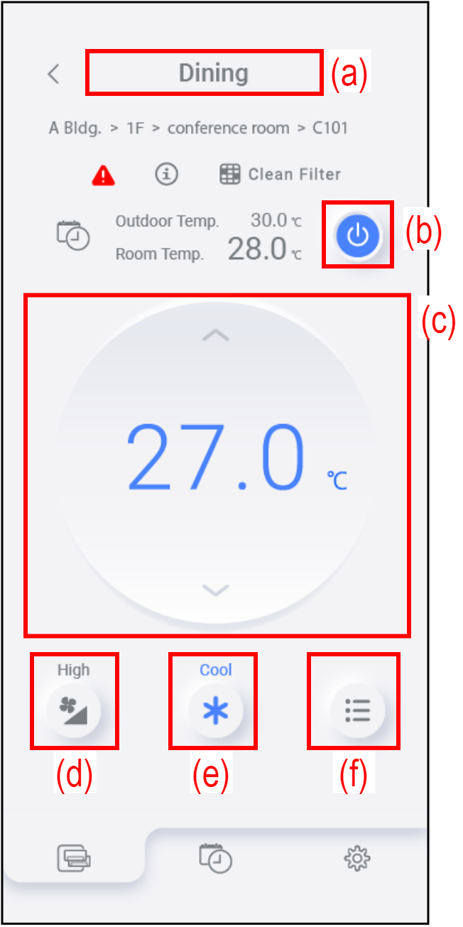 | (f) | Бутон за функционално меню | Докоснете тази икона, за да настроите функциите на климатика. (Вижте „Настройки на функциите“.) |