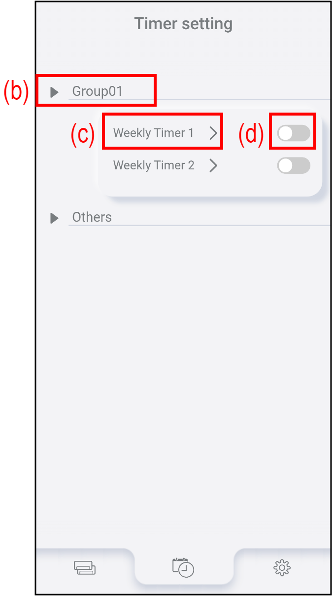 Klepněte (b) pro kontrolu nebo úpravu nastavení týdenního časovače. Podrobnosti naleznete v části „Postup nastavení časovače“.