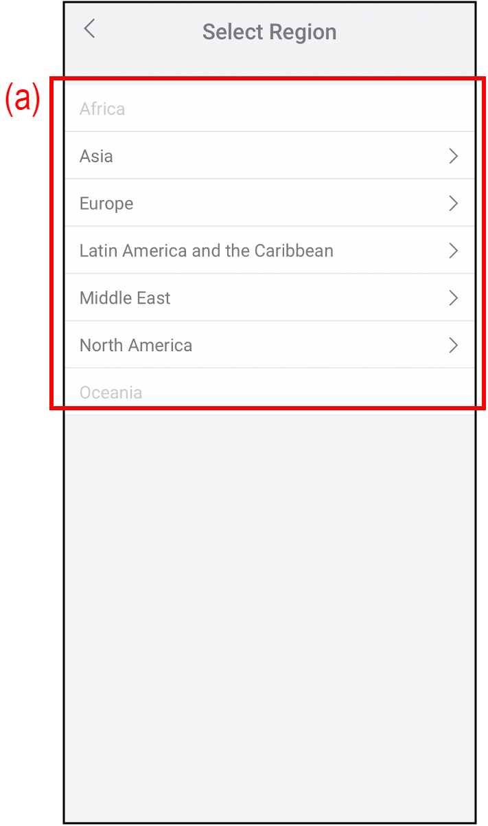 Zobrazí se obrazovka „Select Region“ (Vybrat region). - V seznamu (a) vyberte svůj region.