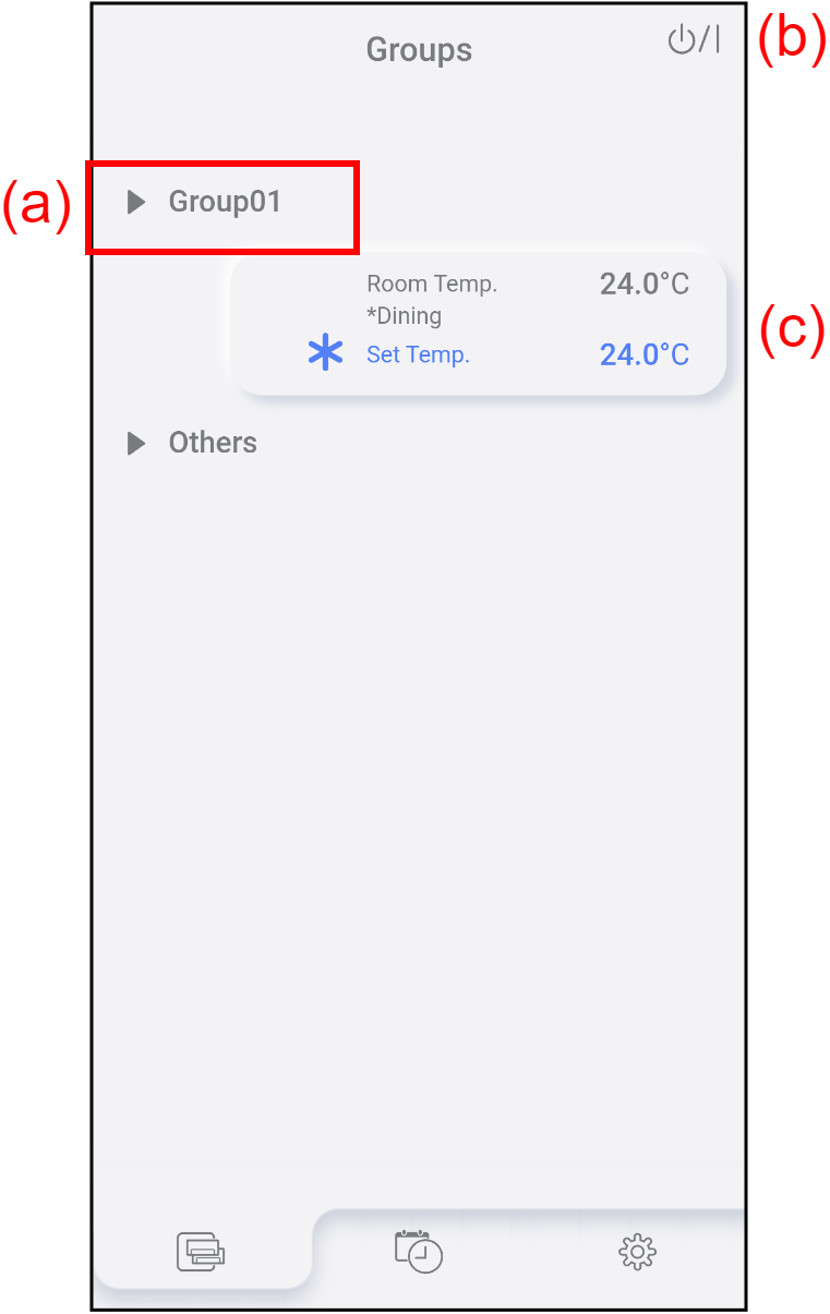 | (a) | Název skupiny | Chcete-li zkontrolovat seznam klimatizací ve skupině, klepněte sem. Podrobnosti najdete v „Obrazovka se seznamem klimatizací“. |