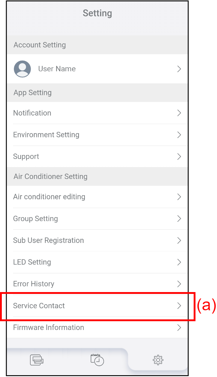 - Klepněte (b) pro volbu klimatizace pro kontrolu nebo úpravu informací v Service Contact (Kontaktu na servis).