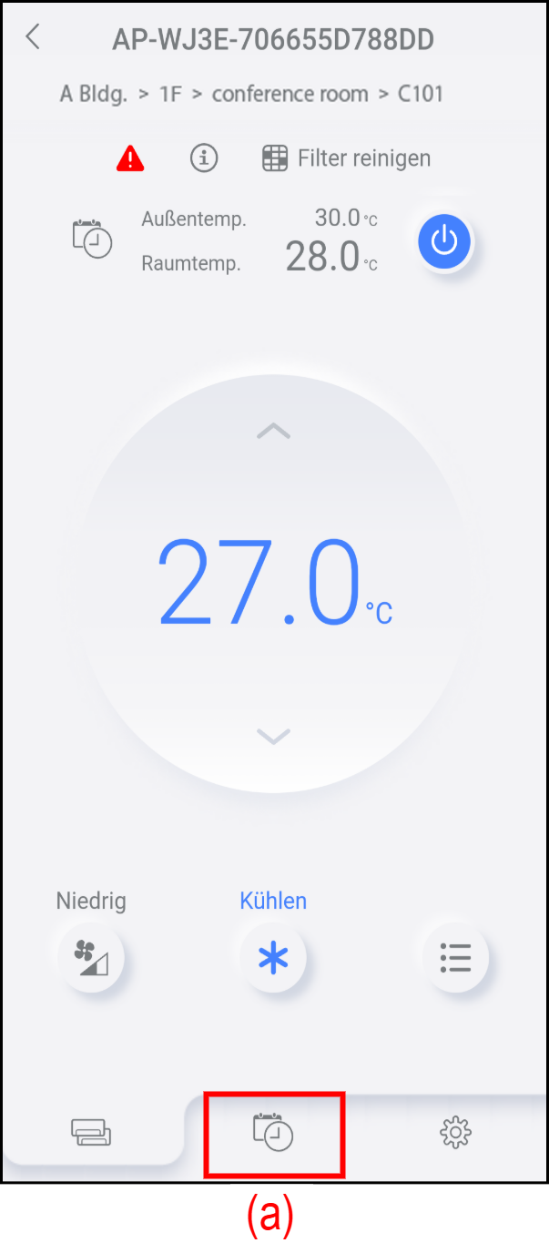 Tippen Sie auf (b), um die in der Gruppe registrierten Klimaanlagen anzuzeigen.