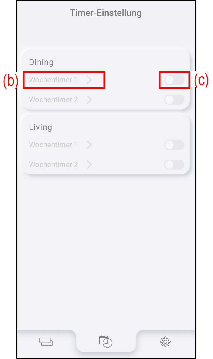 Tippen Sie auf (b), um die Wochentimer-Einstellungen zu prüfen oder zu bearbeiten. Einzelheiten siehe „Timer-Einstellungsvorgang“.