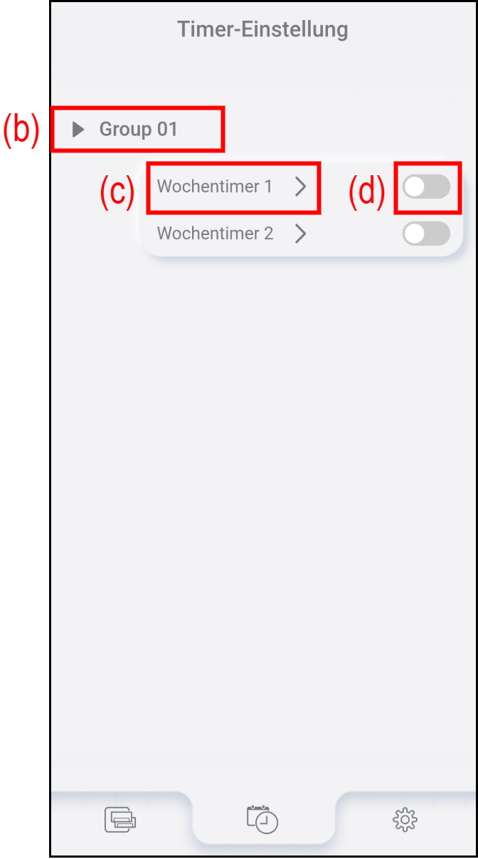 Tippen Sie auf (c), um die Wochentimer-Einstellungen zu prüfen oder zu bearbeiten. Einzelheiten siehe „Timer-Einstellungsvorgang“.