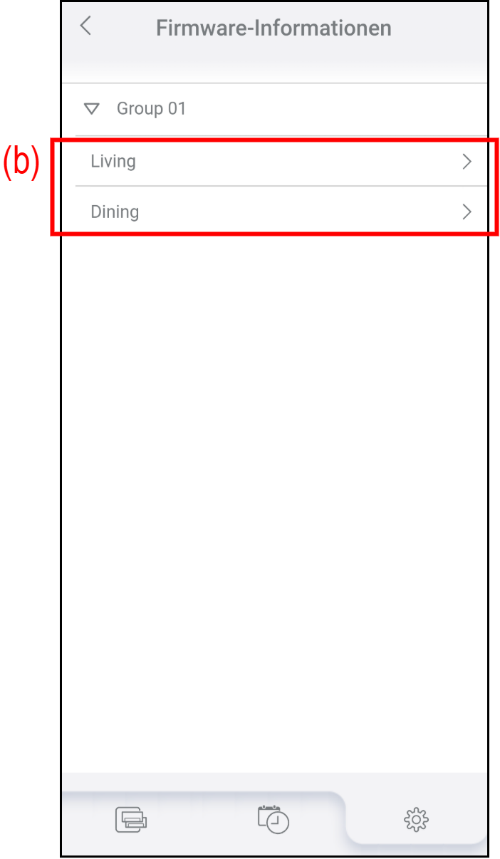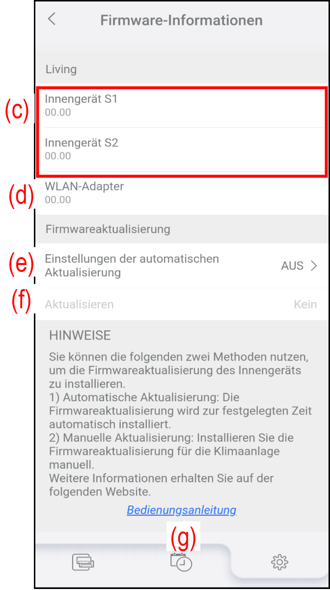 (c) Innengerät Dies zeigt die Firmware-Version des Innengeräts (Software 1 oder Software 2). (d) WLAN-Adapter Zeigt die Firmware-Version des an das Innengerät angeschlossenen WLAN-Adapters an. (e) Einstellungen der automatischen Aktualisierung Tippen Sie, um das automatische Aktualisieren zu aktivieren/deaktivieren oder den Zeitpunkt des Startens des automatischen Aktualisierens festzulegen.