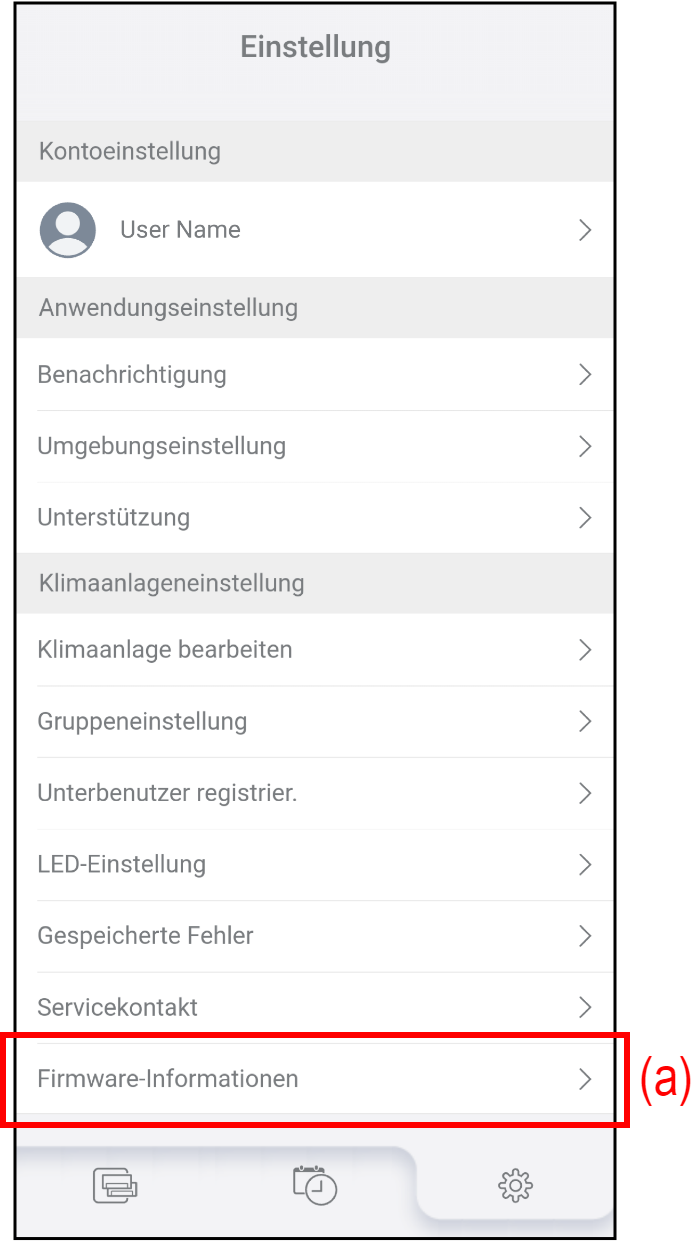 Einzelheiten siehe „Festlegen des Aktualisierungszeitpunkts für die Firmware“.(f) Aktualisieren Tippen Sie, um die Firmware der Klimaanlage oder des WLAN-Adapters manuell zu aktualisieren.