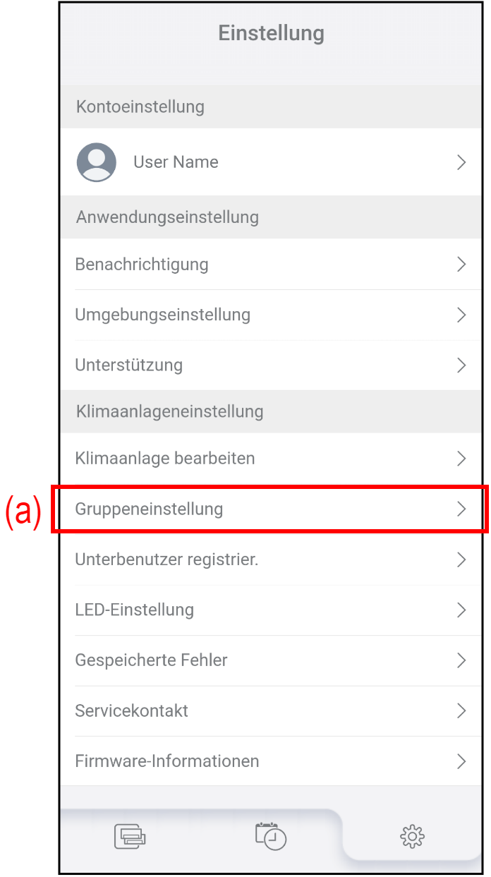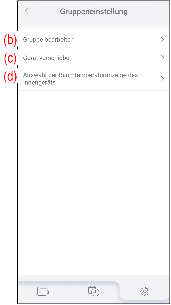 (b) Gruppe bearbeiten Tippen Sie hier, um eine neue Gruppe zu erstellen, den Gruppennamen zu bearbeiten oder die Gruppe zu löschen. Einzelheiten siehe „Gruppe bearbeiten“. (c) Gerät verschieben Tippen Sie hier, um Klimaanlagen in eine andere Gruppe zu verschieben.