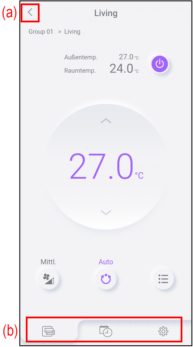 Einstellungen-Registerkarte | Sie können die verschiedenen Einstellungen für diese App oder die Klimaanlagen von dieser Registerkarte überprüfen und ändern. Näheres dazu siehe „EINSTELLUNGEN“. |