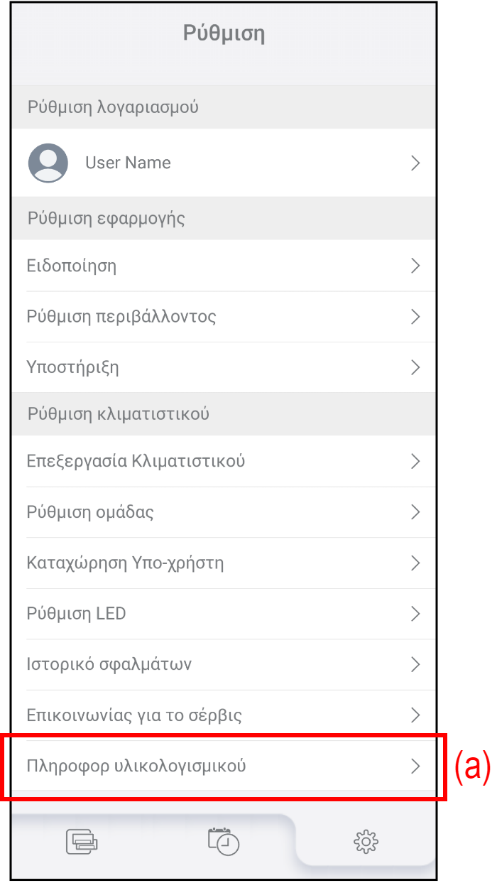 Ανατρέξτε στην ενότητα «Ορισμός του χρονοδιαγράμματος για την ενημέρωση του υλικολογισμικού» για λεπτομέρειες.(f) Ενημέρωση Πατήστε για να ενημερώσετε μη αυτόματα το υλικολογισμικό του κλιματιστικού ή του Προσαρμογέα WLAN.